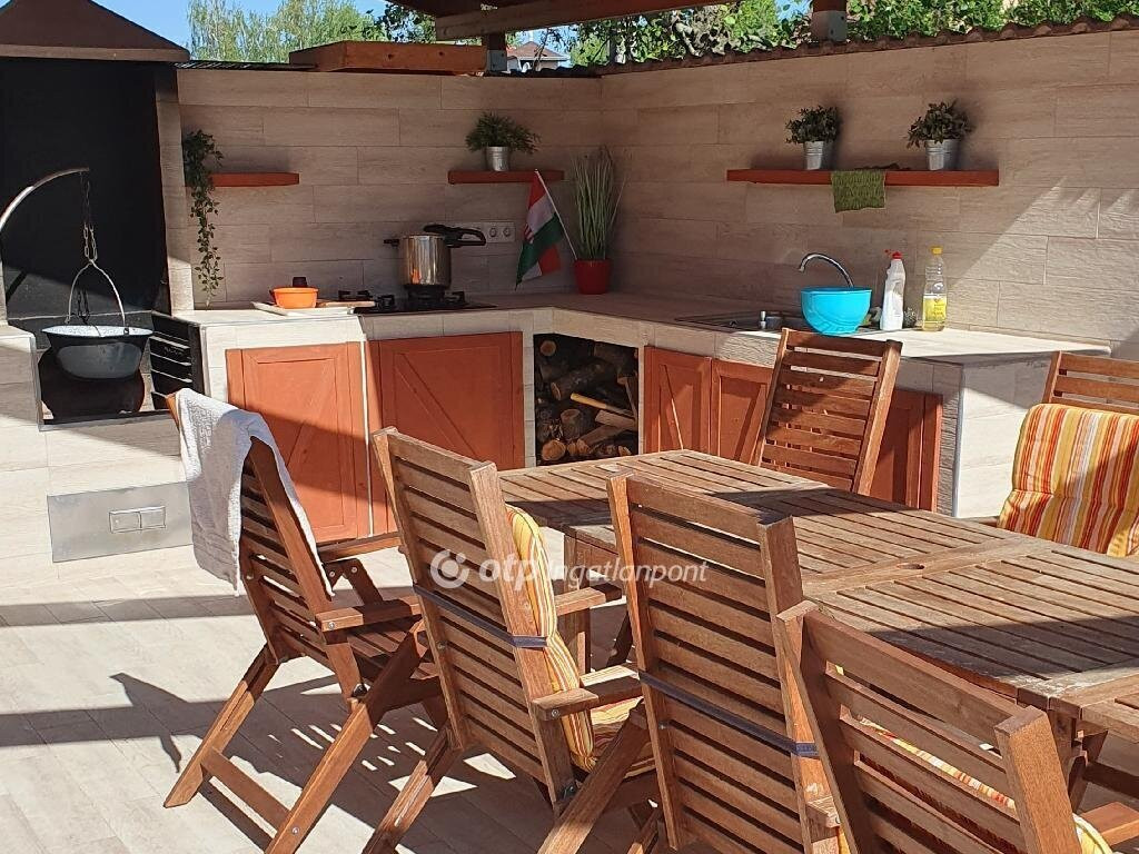 Az ingatlanba belépve egy tágas, széles előszoba tárul elénk, ahonnan nyílnak a helyiségek. Hatalmas, modern, minden igényt kielégítő konyhai gépekkel szerelt konyha bárpulttal és nagy étkezőasztallal, tágas, modern nappali hófehér dekorfallal és szekrényekkel kijárattal a teraszra, 3 szoba, beépített szekrények, két fürdőszoba, mosókonyha, amely gardróbszoba is, illetve egy pazar árnyékolható, intim környezetet biztosító fedett terasz nyújtja a kényelmet és a nyugalmat. A pezsgő élet helyszíne pedig a ház előtti részben található pergolás, nagyrészt fedett kerti sütögető és az ehhez tartozó minden igényt kielégítő kemence, mosogató, előkészítő pultok, nyolc személyes kerti bútor. Mellette szintén fedett külön tárolórész a bicikliknek, supnak, motornak, amelyek a környék felfedezésére, a mintegy 50 méterre található tavak kihasználására szuper lehetőséget kínálnak. Ha pedig a napi kondíciónkat szeretnénk karban tartani, és egyéb sportra vágyunk csak a hátsó kertig kell mennünk, ahol egy külön 16 m2 es, 32 m2-es betonalapú szigetelt faházban egy modern, szinte új gépekkel felszerelt kondi terem vár minket. Ennek betonozott terasza alkalmas lehet jakuzzi, vagy medence felállítására is, de a hátsó kert is bőven ad lehetőséget akár nagyobb medence, vagy gyermekeknek játszótér kialakítására, ehhez a több helyen kialakított kerti csap is nagy segítség. Gyönyörű zöld tujákkal, pampafüvekkel határolt a ház és a telek, a kertben jónéhány termő gyümölcsfa rügyezik.