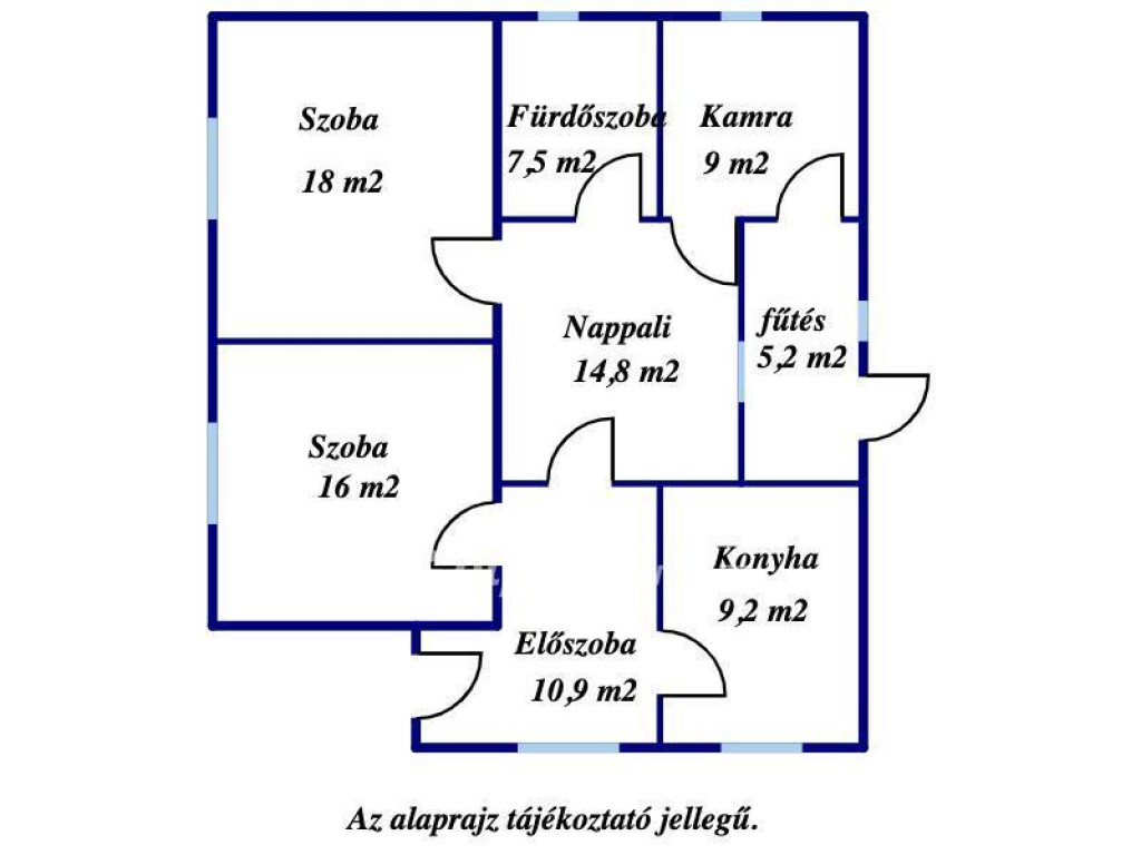 Az épület helyiségei: előszoba, 2 szoba, nappali, konyha, fürdőszoba, kamra és egy fűtési helyiség. Nettó alapterület: 90,6 m2.