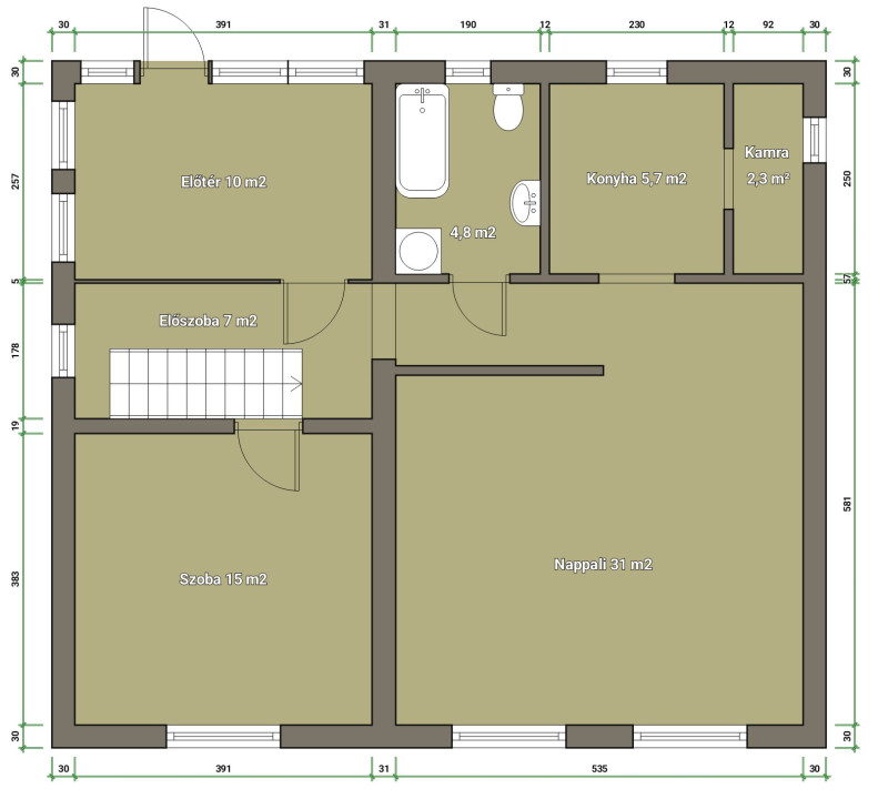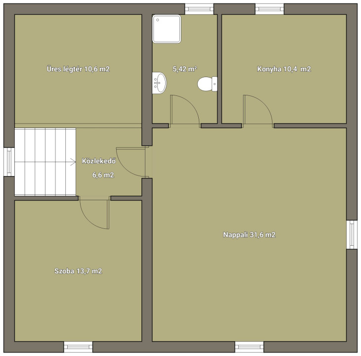 A földszint 76 m2 nappali (31 m2) + szoba (15 m2), konyha kamrával, fürdőszoba-WC, előszoba (innen indul a lépcső a felsőszintre) helyiségek találhatók.