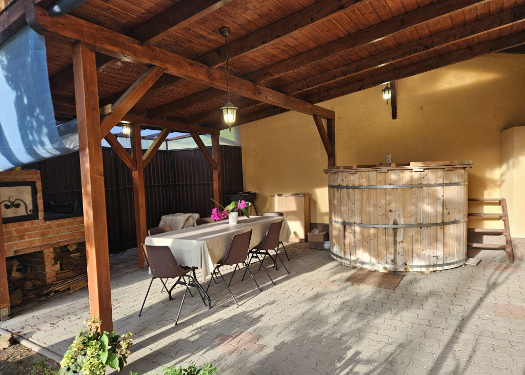 A kertben nagy terasz - a két ház kapcsolódásánál - került kialakításra, mely nagyobb társasági összejövetelek rendezésére is alkalmas.
