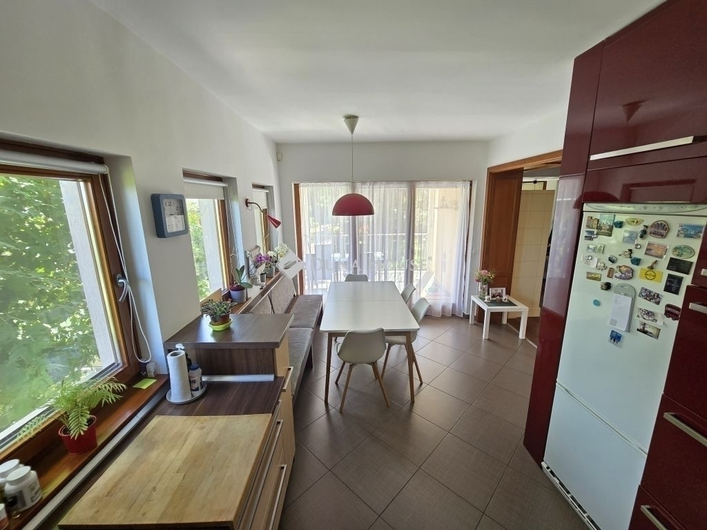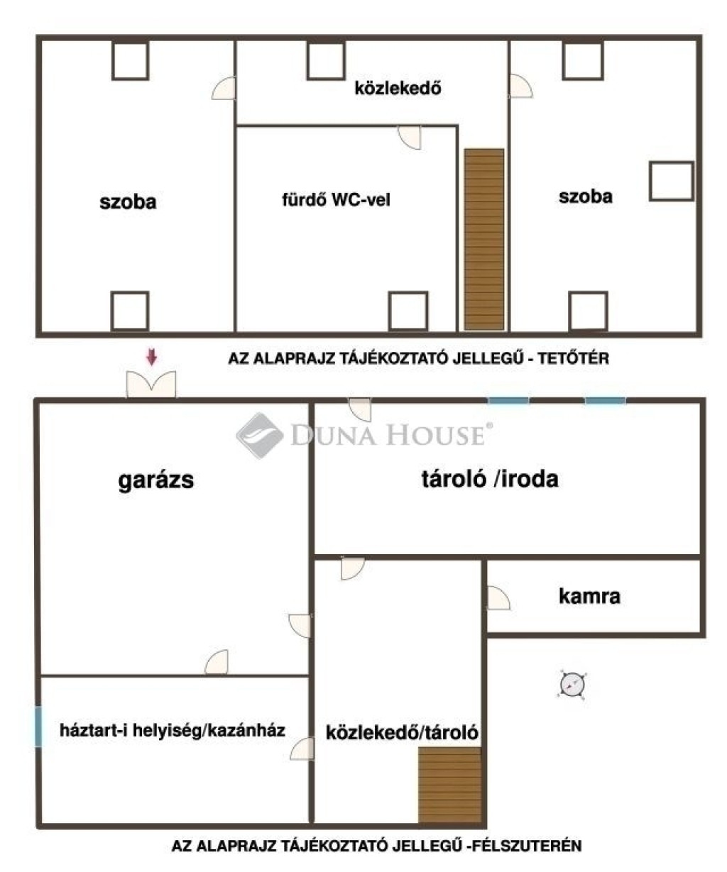 Beosztása rendkívül praktikus és élhető: a ház központi tere a nagy nappali, melyhez egy átjárón keresztül kapcsolódik a konyha és étkező együttese. Az étkezőből egy fedett teraszra juthatunk, mely tökéletes helyszíne a reggeli kávézásnak, nyár esti beszélgetéseknek. A földszinten még két hálószoba található, a köztük lévő közlekedőből nyílik az oldalsó, nyitott, fantasztikus panorámával rendelkező másik terasz. Továbbá fürdőszoba, gardrób, külön WC és előszoba került kialakításra ezen a szinten. Az emelet elrendezése: két hálószoba és egy tágas fürdőszoba WC-vel. A félszuterén szinten a kiszolgáló helyiségek vannak, tárolók, kamra és egy háztartási helyiség, mely egyben kazánház is, ill. a közel 35 nm-es garázs. Az egyik tároló külön közvetlen kijárattal rendelkezik a kert felé, ezért akár önálló lakrészként, irodaként is funkcionálhat.