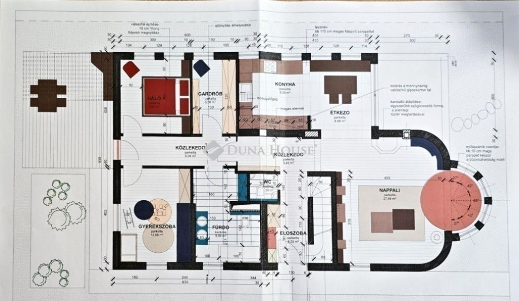A nappali + 4 hálószobás ingatlan nettó 164 nm-es, a félszuterén szint teljes területét beszámítva 278 nm-es, ill. a fedett terasz 8 nm-es, a nyitott terasz pedig 15 nm-es.