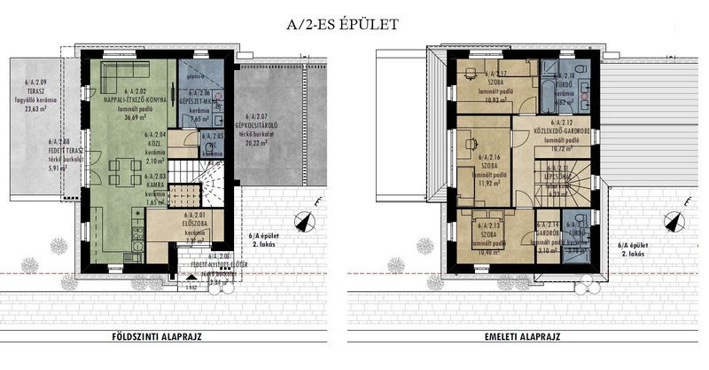 Földszint (85.61m2 + teraszok + saját kert): előszoba (7.37m2), konyha – étkező - nappali (36.69m2), kamra (1.65m2), közlekedő (2.1m2), wc (1.68m2), mosókonyha (7.65m2), garázs (20.22m2), fedett – nyitott előtér (2.34m2), fedett terasz (5.91m2).