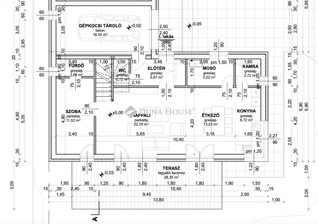 Nettó hasznos lakótér 131 m2 + 18,30 m2 garázs + 2 db terasz / 28,35 m2 + 16,35 m2 /