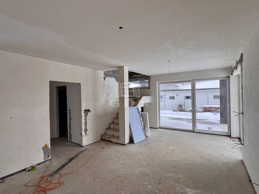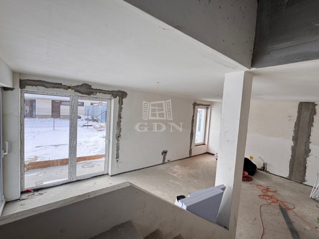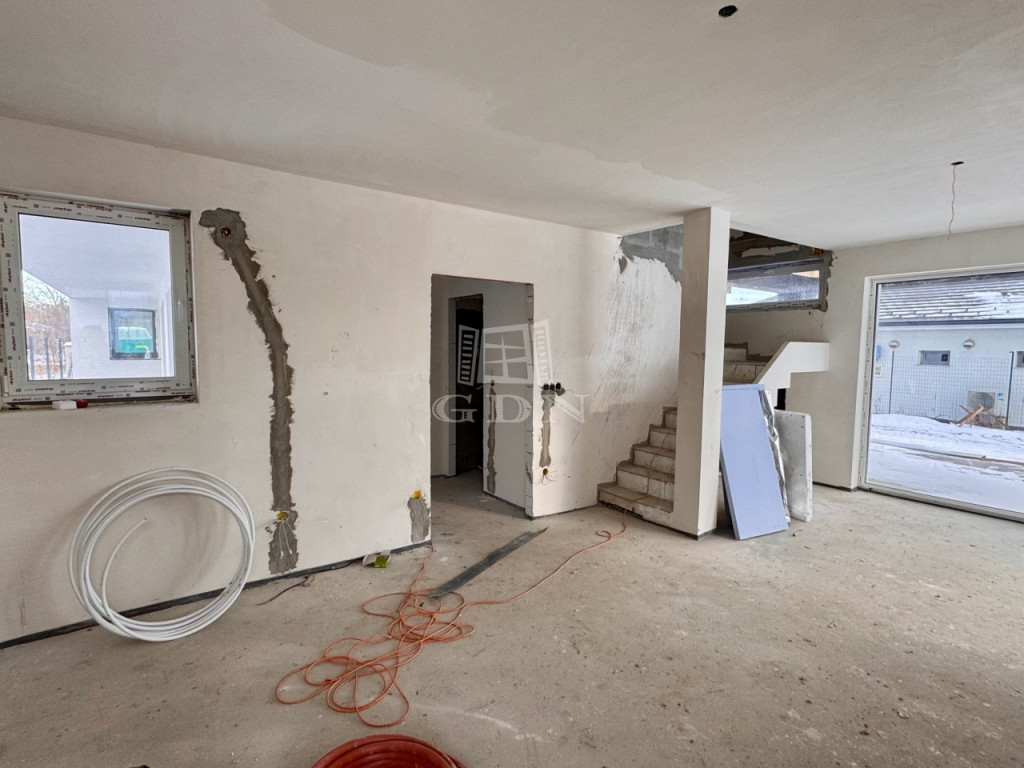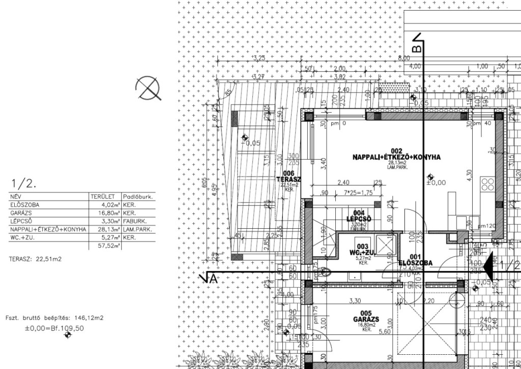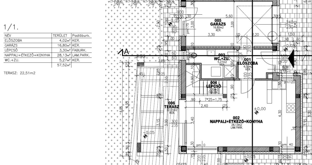 előszoba 4 m2, nappali-étkező+ konyha 28 m2, zuhanyozó +WC (5,27 m2), emeletre vezető lépcsőtér 3,3 m2, garázs 17,4 m2, plusz egy 22,5 m2-es terasz került kialakításra.