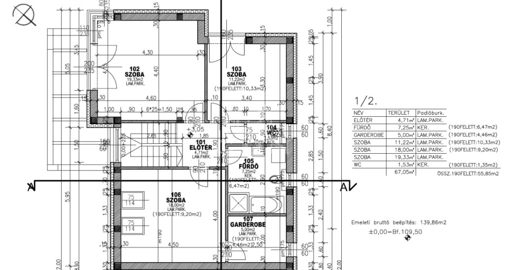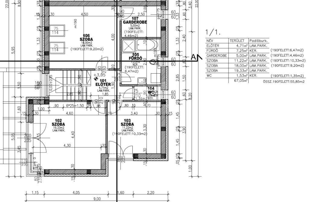 közlekedő-lépcsőtér 9,4 m2, 3 szoba (19,33 m2, 11,22 m2, 9,20 m2), fürdőszoba (7,25 m2), WC (1,53 m2), gardrób (5 m2).