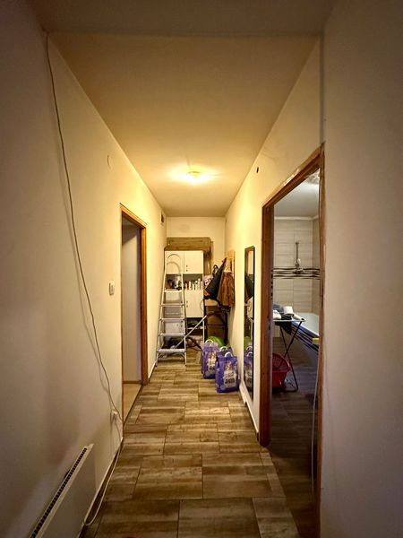 Hátsó lakásrész: előtér – nappali - konyha(28nm), fürdőszoba + wc (7.1nm), közlekedő (5.6nm), szoba (14nm), nagy fedett terasz.
