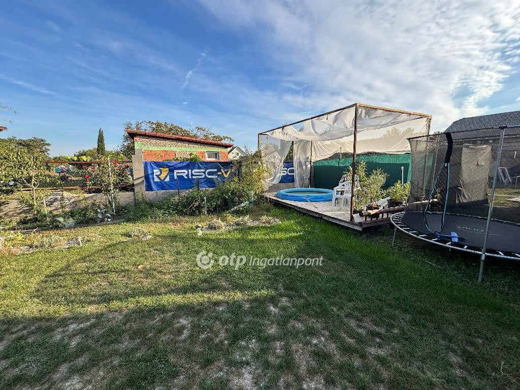 fedett terasz . A tetőtér kialakítható laktérré, masszív, stabil falazat van. A kertben beton alapon egy szaletli áll a medencének, gyermek játszótér, és nagy füves terület a labda csatákhoz, kerti tó, hinta, egy 10 m2-es tároló, növények, fák. A fák azonban konténeresek, amit a tulajdonosok visznek magukkal. Két autónak kocsi beállási lehetőség van az udvar első utcafronti részén. Elfogadó, rendezett szomszédság van, kedves házaspár tulajdonosok, tehermentes az ingatlan!