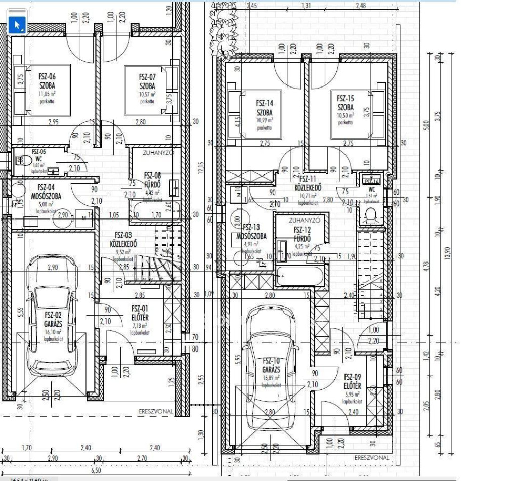 Ikerház területe áll: 105, m2 lakótér + 23 m2 teraszok + 15,9 m2 garázs, azaz 120,2 m2 hivatalosan.