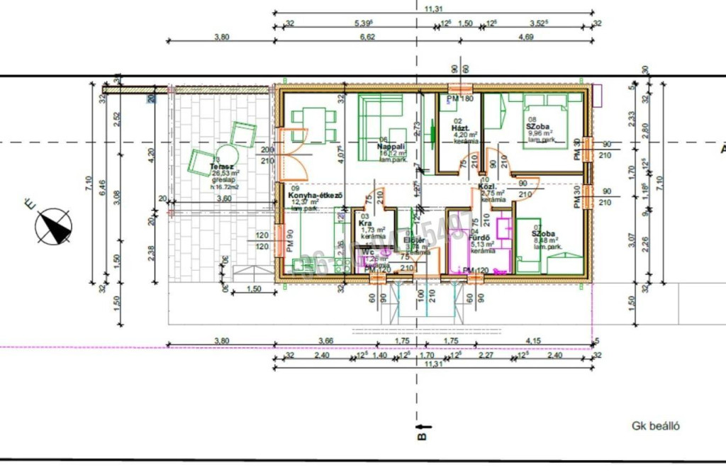 A lakóterület, 66 m2 plusz 26,5 m2 terasz. (Összesen: 92,5 m2) Panoráma ajtó nyílik közvetlenül a teraszra az amerikai konyhás nappaliból. Az ingatlanban található még 2 hálószoba, fürdő, külön WC, háztartási helység, a bejáratnál szélfogó.