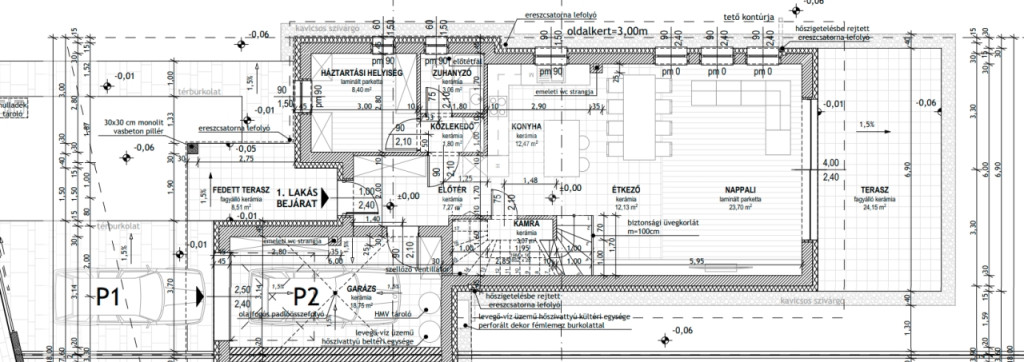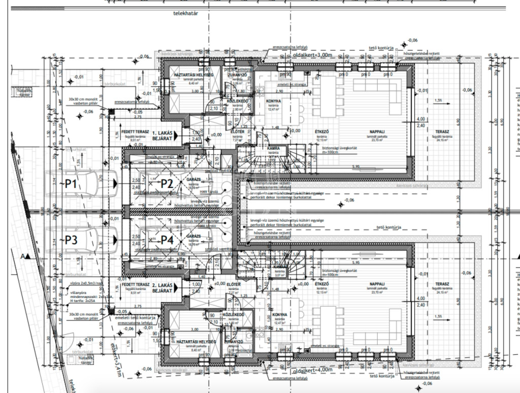 A garázzsal épülő ház, nappalival + 4 szobával, 3 fürdőszobával + mosdóval, valamint egy 24 m2-es kertkapcsolatos terasszal, kerül kialakításra.