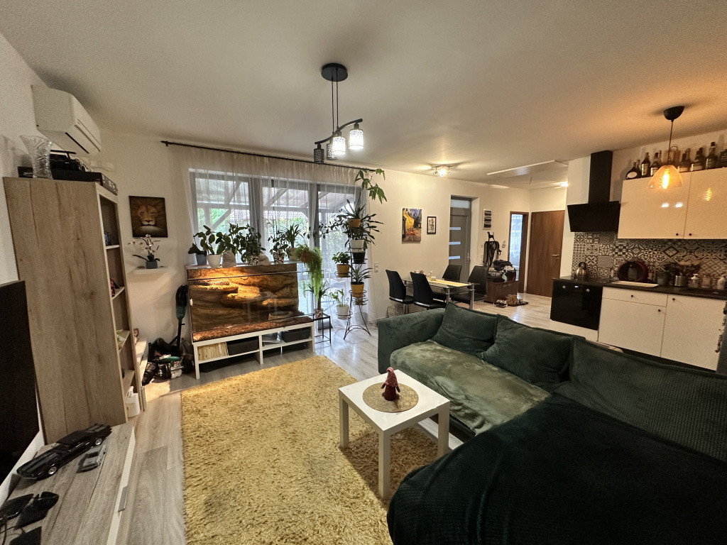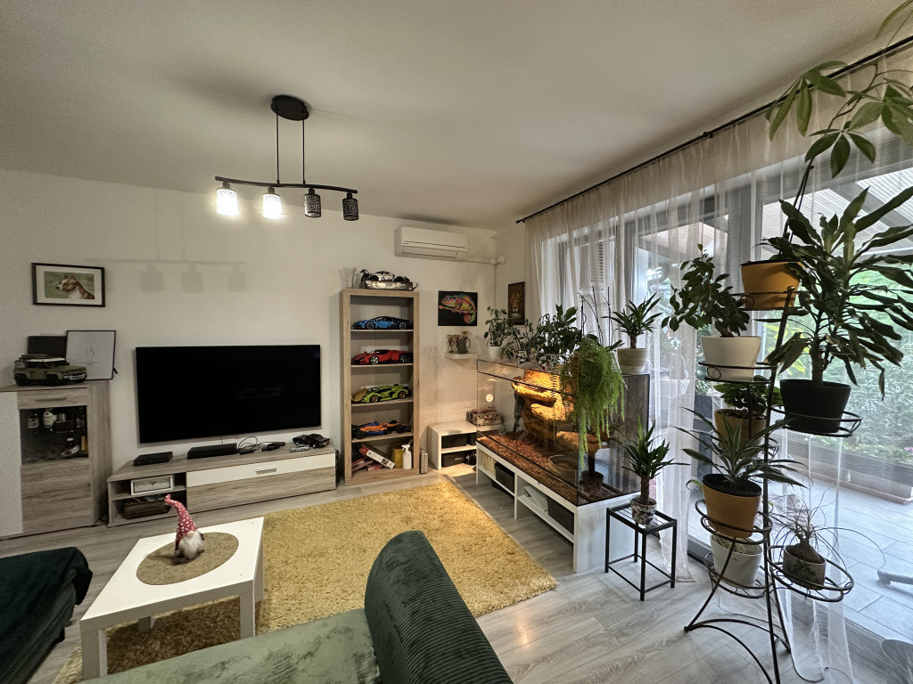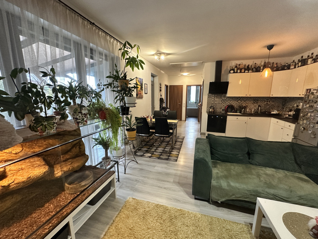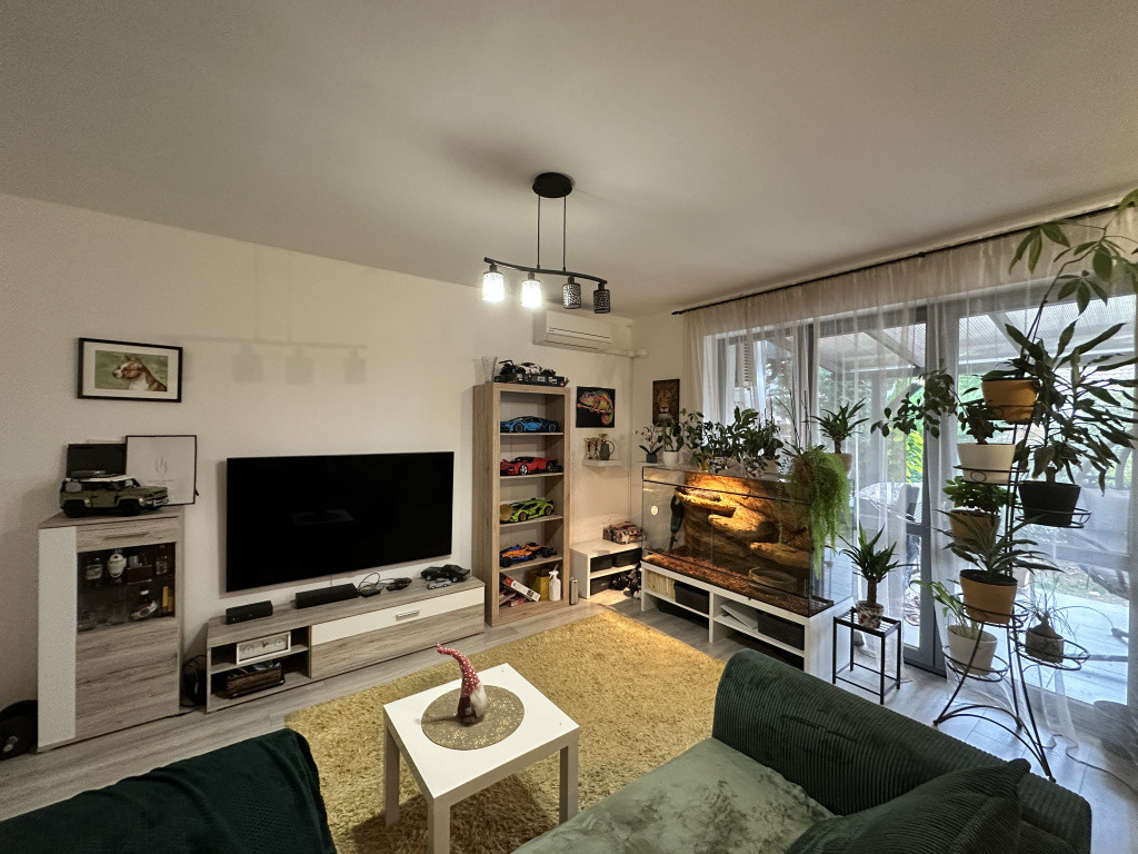 Amerikai konyhás nappali + 2 szoba, fürdőszoba, WC, mosószoba (elektromos kazán, ARISTON villanybojler) -a lakótér átgondolt elosztású, világos és tágas. A nappalihoz közvetlenül kapcsolódik egy 20 m²-es fedett terasz, amely tavasztól őszig a nappali meghosszabbításaként szolgál.