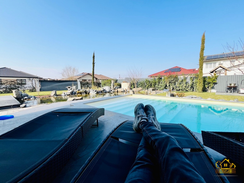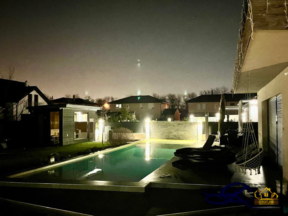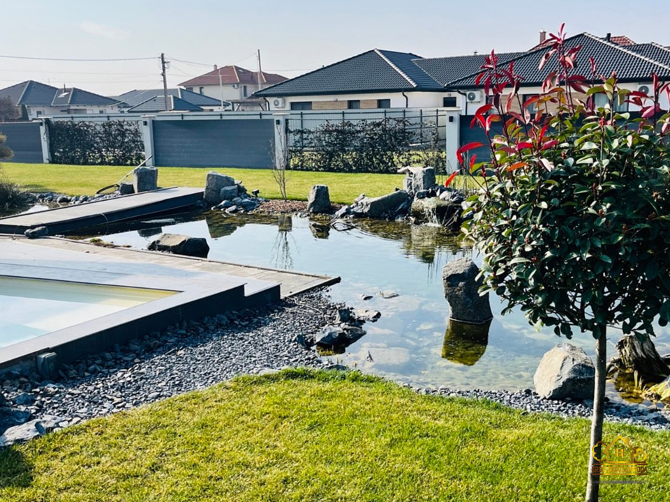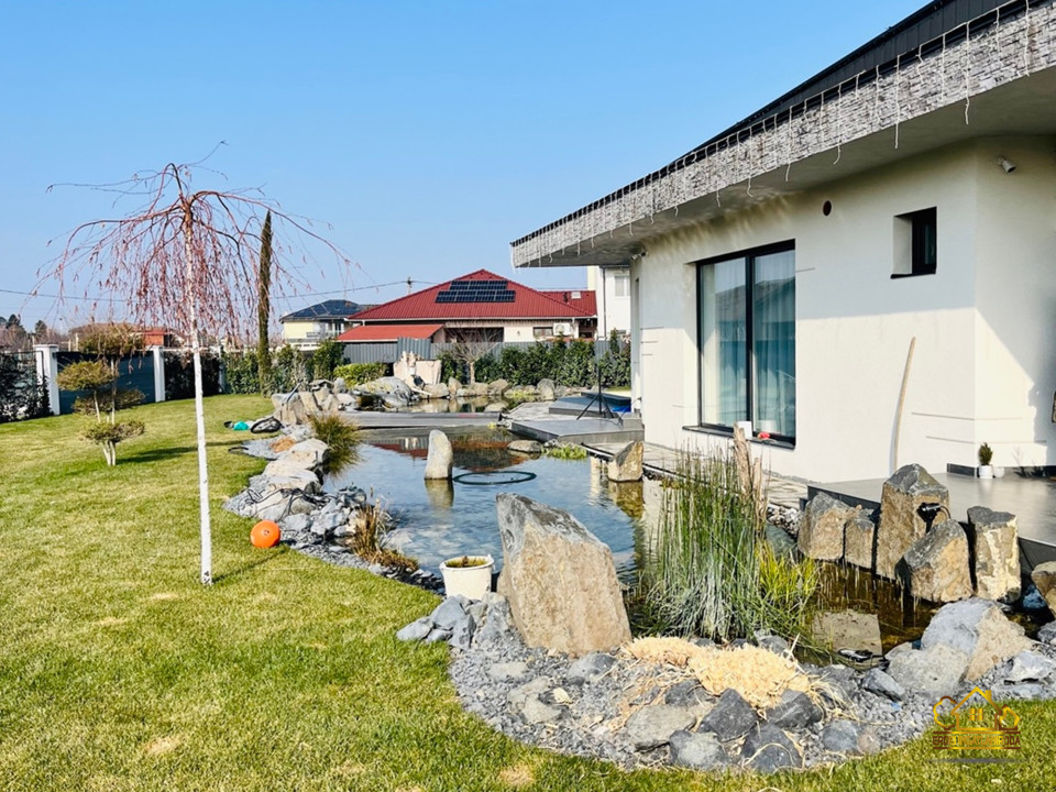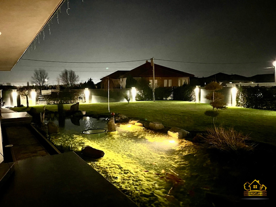 A parkosított, óriási 1023 m2-es kert központi eleme a különleges, öntisztító dísztó három csobogó vízeséssel, vízililiomokkal és közel kétszázféle növénnyel. A nagyméretű, LED-világítású medence nyakmasszírozó-vízeséssel és a mellette elhelyezkedő kerti szauna valódi wellness hangulatot teremt.