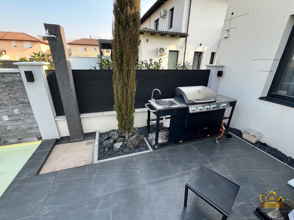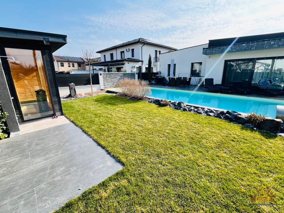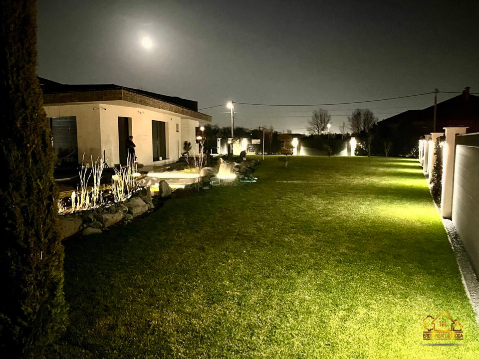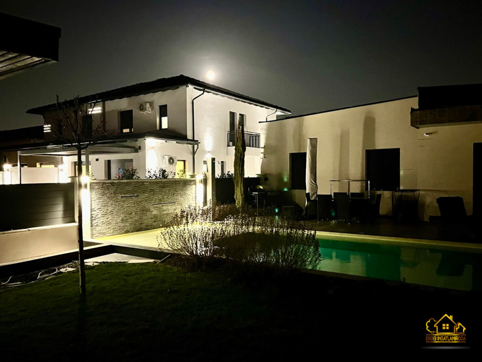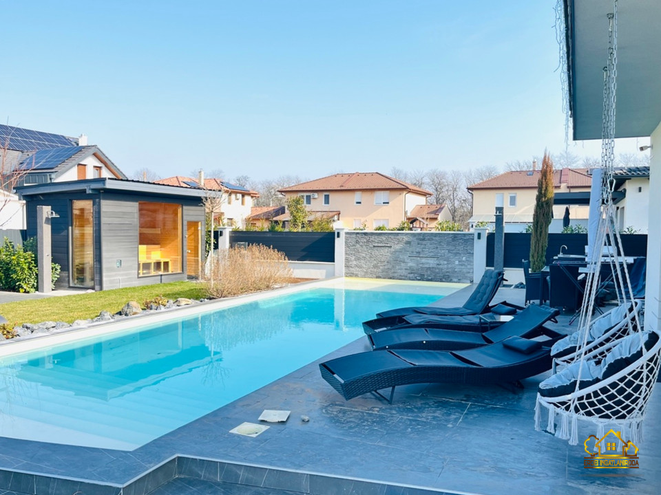 A parkosított, óriási 1023 m2-es kert központi eleme a különleges, öntisztító dísztó három csobogó vízeséssel, vízililiomokkal és közel kétszázféle növénnyel. A nagyméretű, LED-világítású medence nyakmasszírozó-vízeséssel és a mellette elhelyezkedő kerti szauna valódi wellness hangulatot teremt.