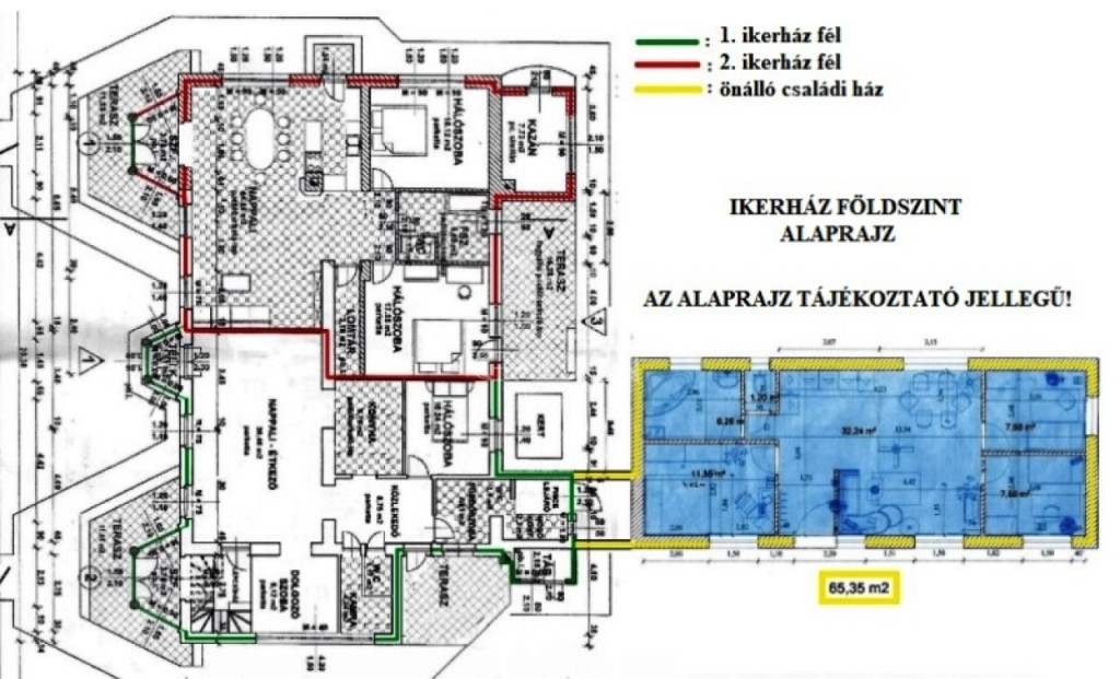 Ingatlan elosztása (két szinten – 160 m2): nappali+étkező+konyha, 4 szoba, 2 fürdő, 2 wc, előtér, tároló, kazánház, terasz (16 m2)