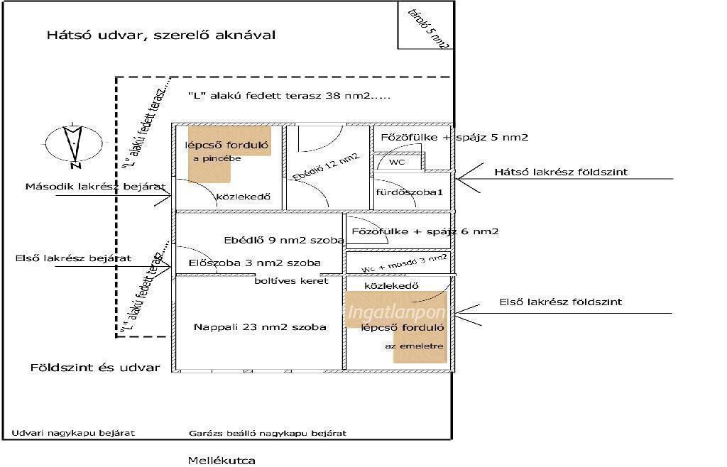 Földszinten: két külön bejáratos lakrész, összesen két előszoba, két étkező, két kis konyha, egy nappali, két WC, egy fürdőszoba,