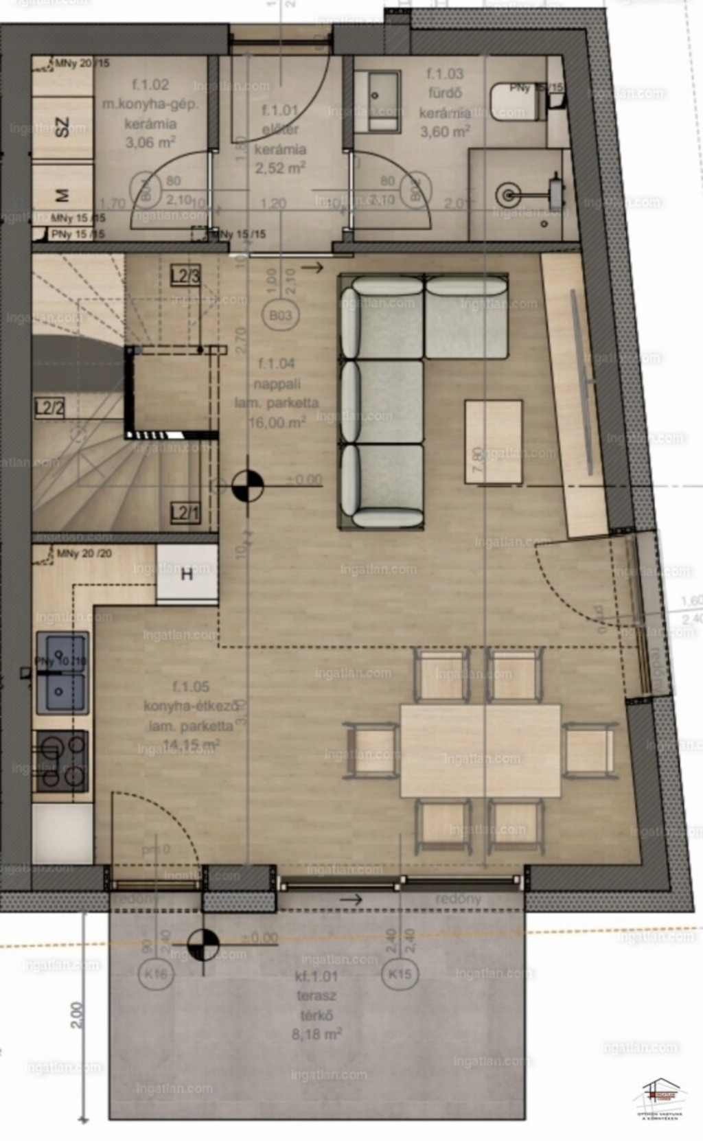 Magas minőségű burkolatok (8000 Ft/nm), a hideg/meleg burkolat és a beltéri ajtók színe választható.