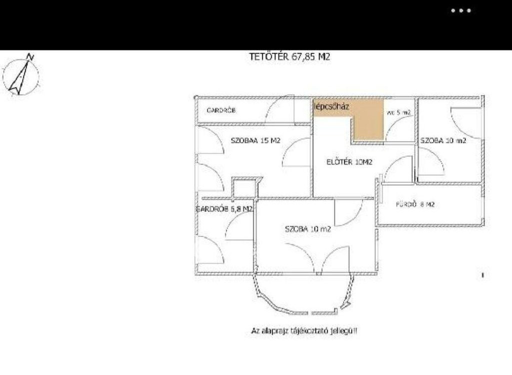 - tetőtér beépítettsége 100 % amely alapterülete 67,85 m2 és a helyiségei: 3 szoba, fürdőszoba, tároló, közlekedő.