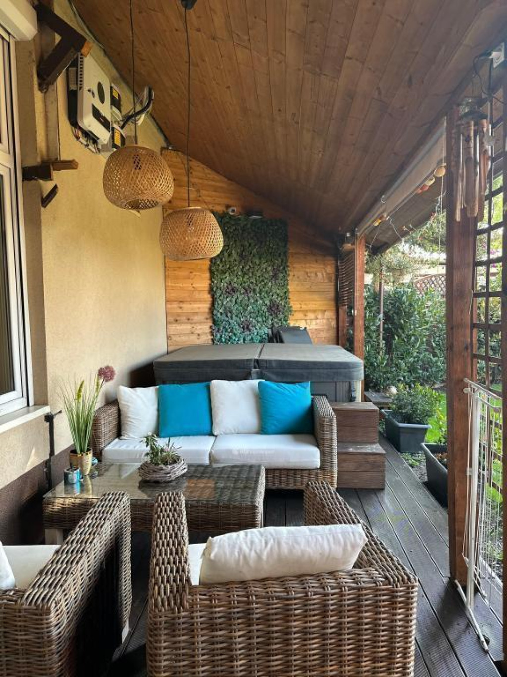 Automata vezérlésű dekorvilágítás mozgásérzékelőkkel, reflektorokkal teszi varázslatossá a teljes kertet és a 23 m2-es fedett teraszt, ahol még egy 6 személyes jakuzzi is helyet kapott, amely télen-nyáron tökéletes relaxációs élményt biztosít.