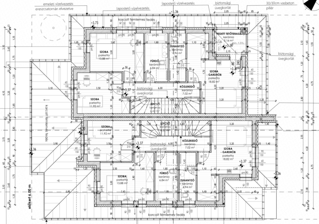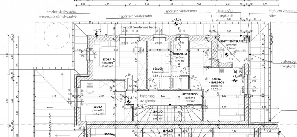 • Tető: monolit födém, lapostetős kialakítás, antracit színű fémlemez fedéssel