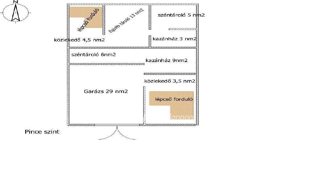 Pince szinten: zárt garázs, vegyes tüzelésű kazán, tüzelő és tároló helyiségek,
