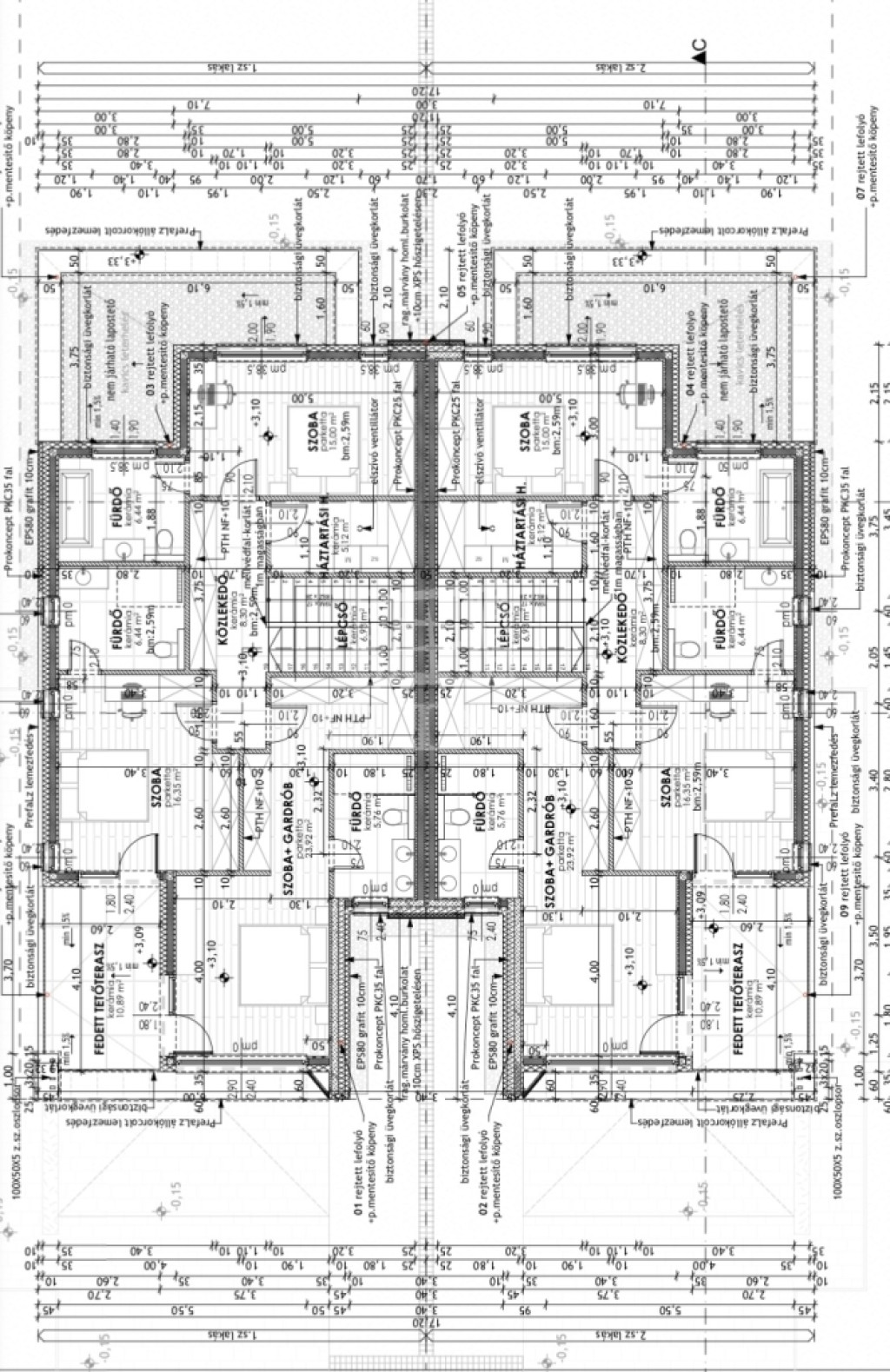Külső nyílászárók: Az ablakok és az erkély ajtók HOFSTADTER márkájú korszerű hőhídmentes műanyag alumínium 5 kamrás profilrendszerből készülnek, 3 rétegű hőszigetelő üvegezéssel a terveken jelölt helyen a nagyméretű erkélyajtók, tolóajtós kivitelűek homlokzati nyílászárók elektromos mozgatásúak.