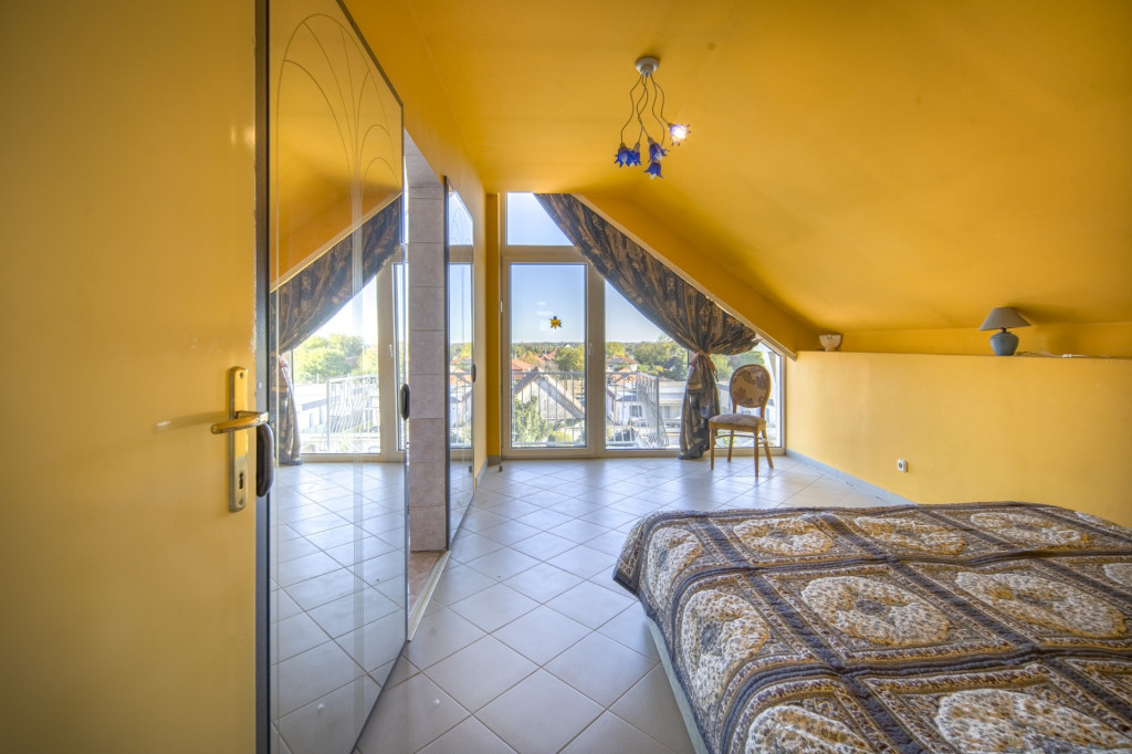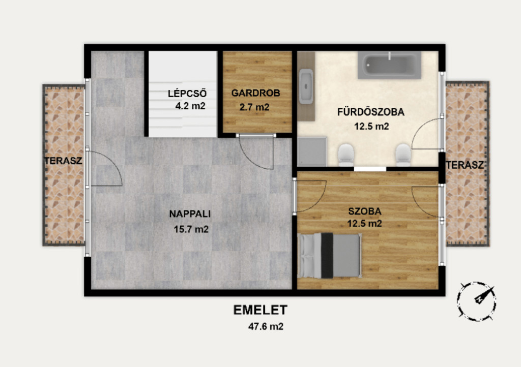 A legfelső, 47,6 m²-es szinten egy gardrób, egy fürdőszoba, egy hálószoba és egy nappali található.