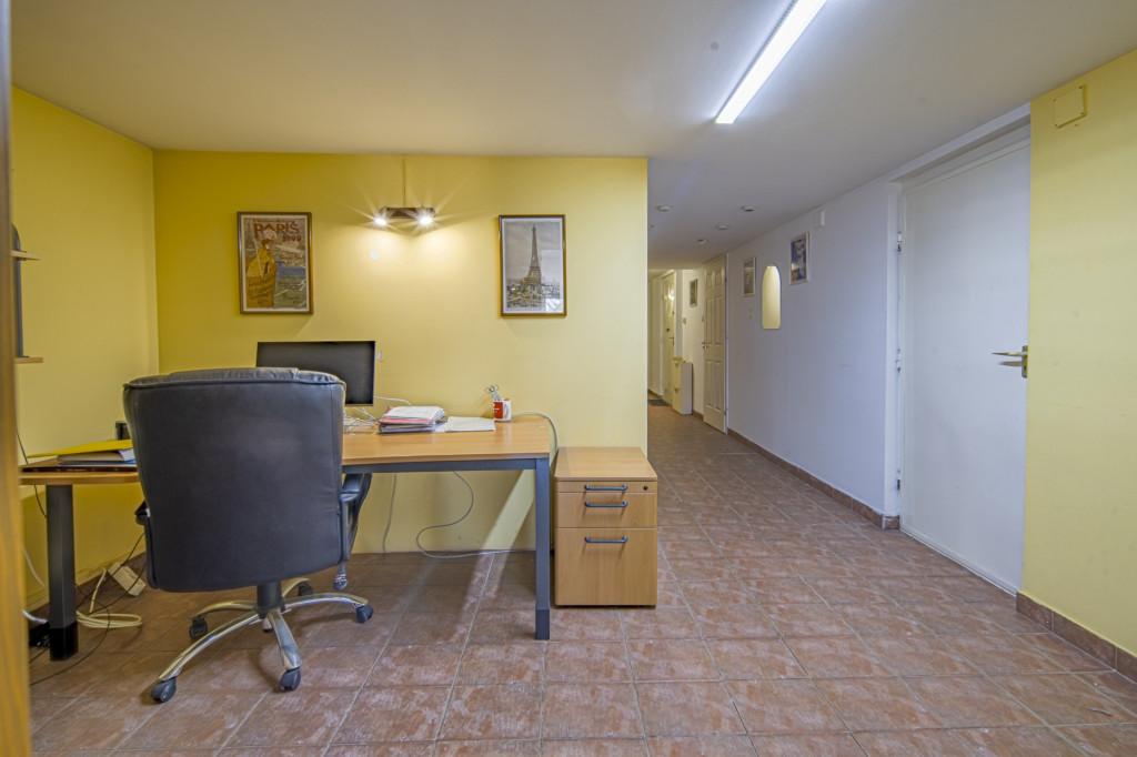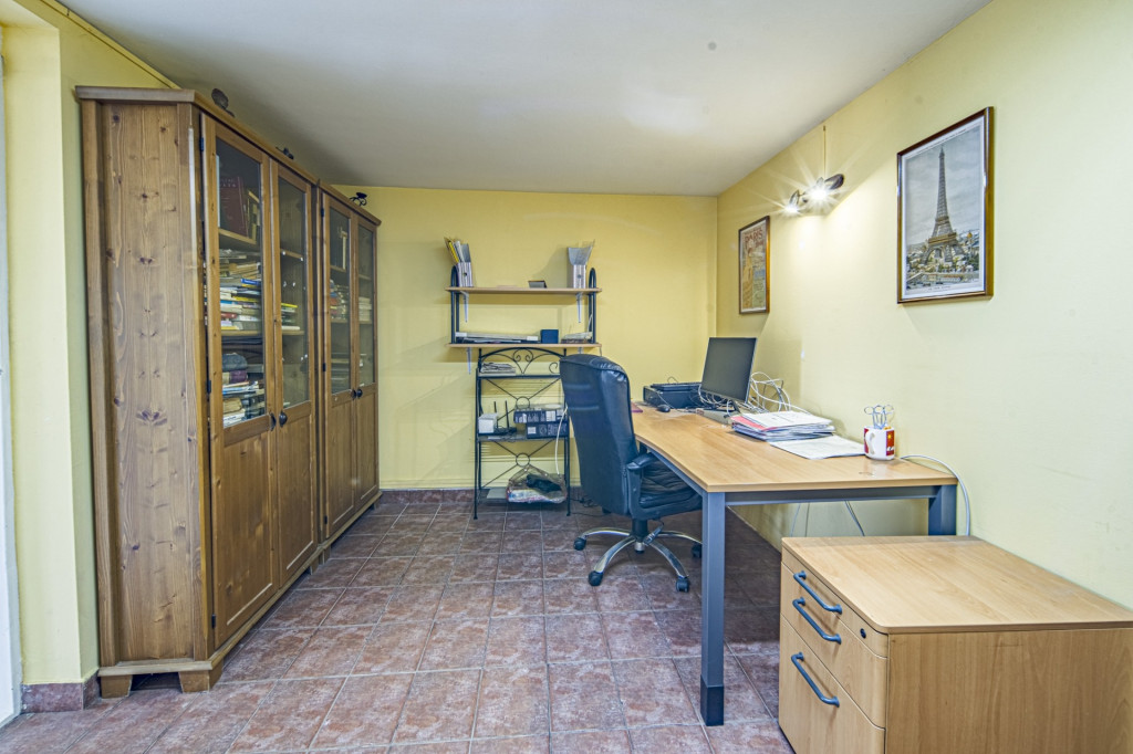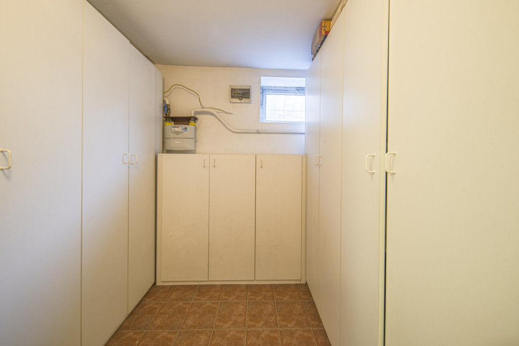 A telek adottságainak köszönhetően az alsó szinten egy nagyméretű, 59 m²-es nappali, egy háló, egy gépészettel ellátott fürdőszoba, valamint 120 m²-en három tároló található, amelyekből akár három külön szoba is kialakítható, ahonnan közvetlen kijárat nyílik a kertbe.