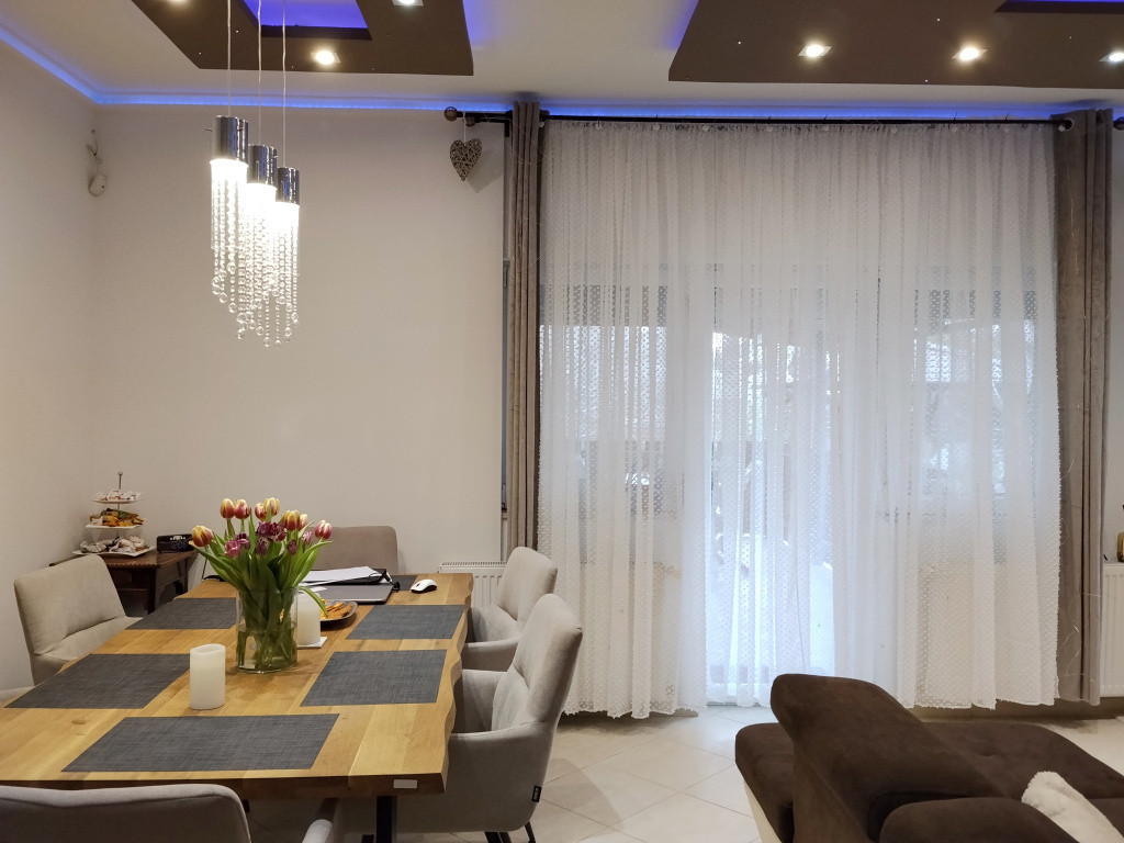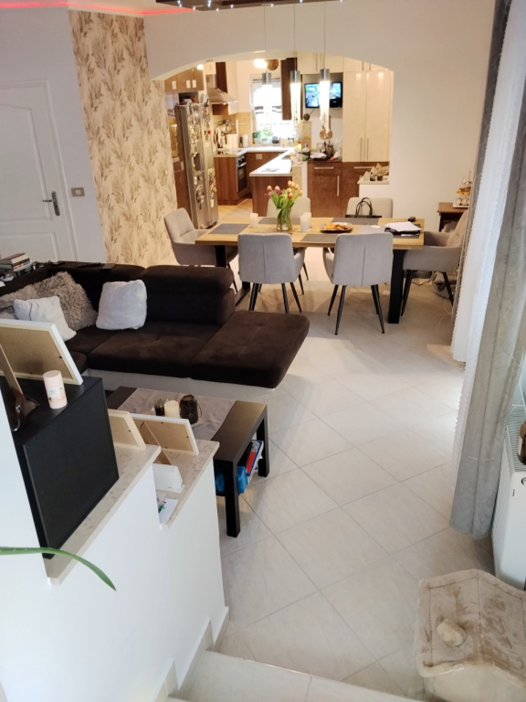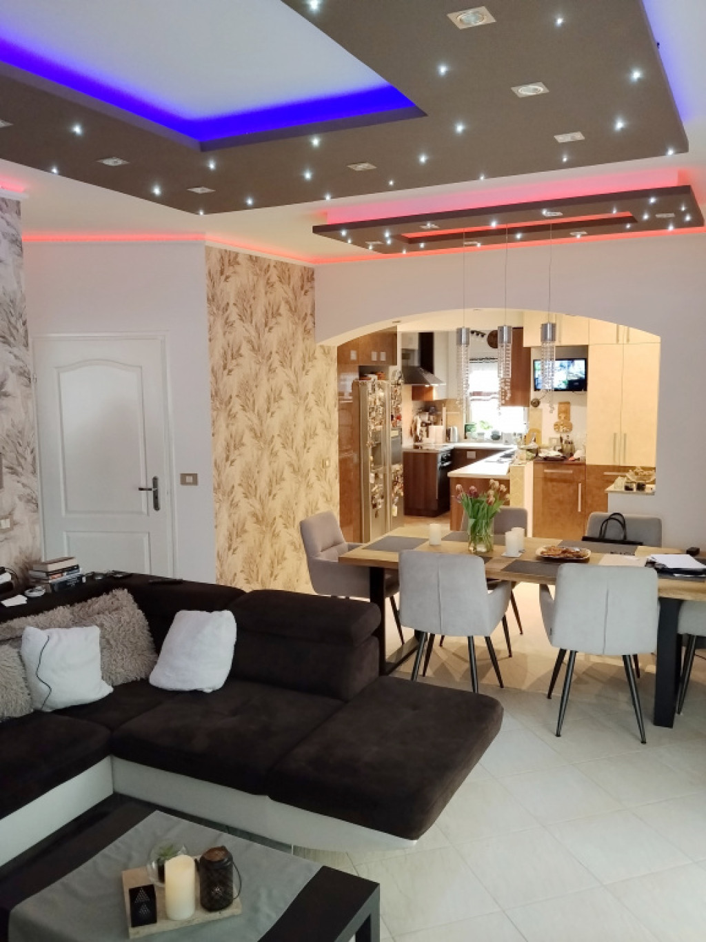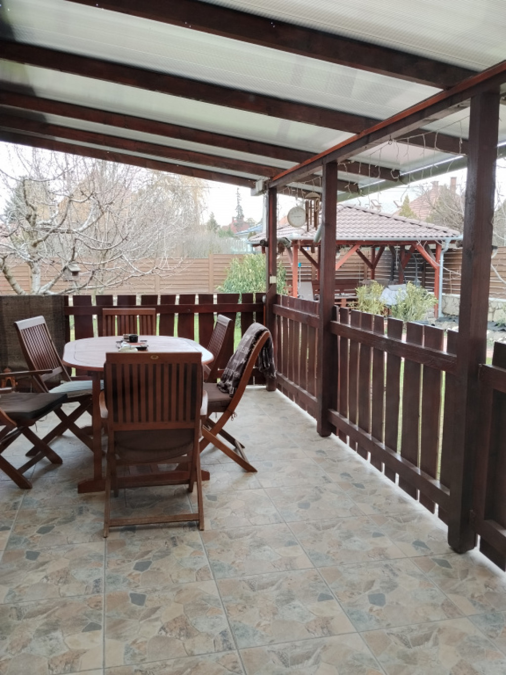 -tágas, étkezős nappali (közvetlen kijárattal a polikarbonáttal fedett teraszra)