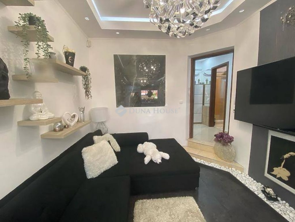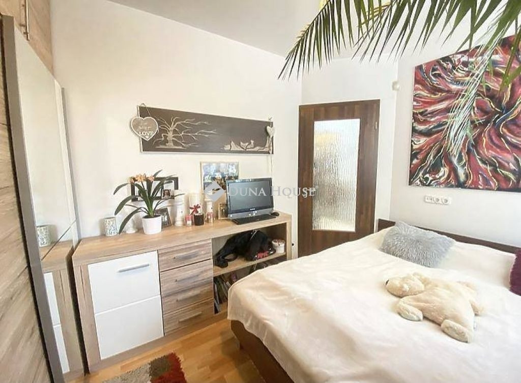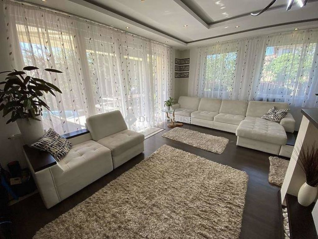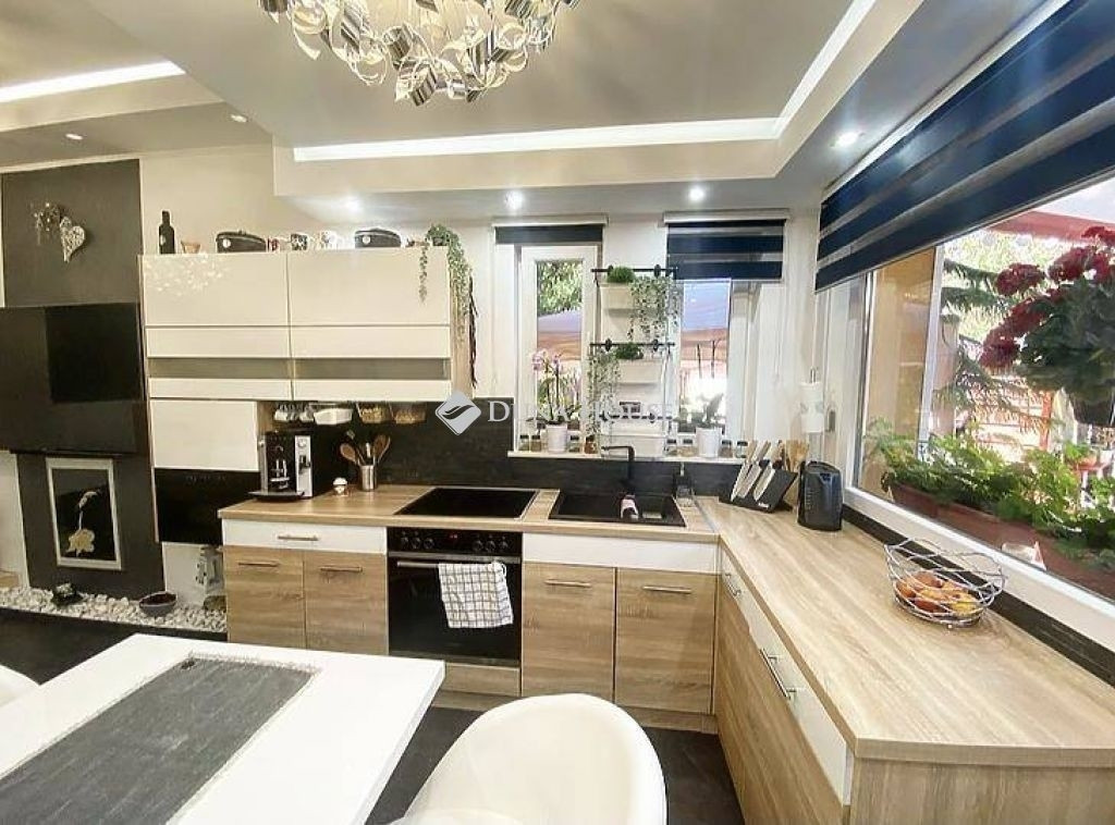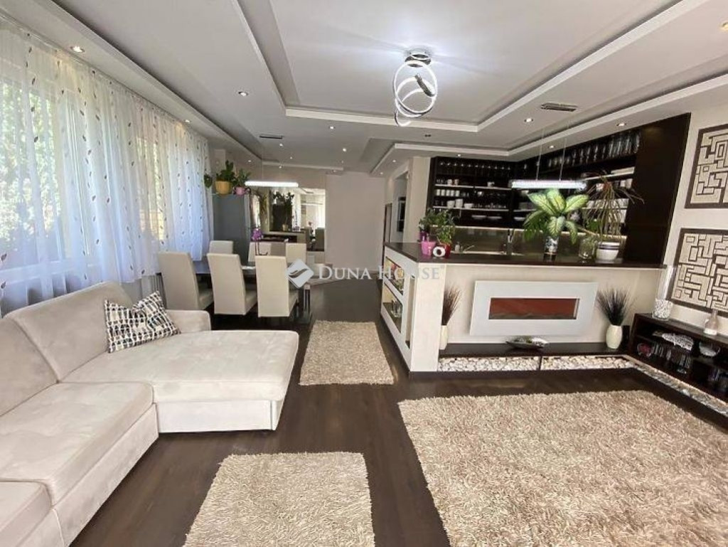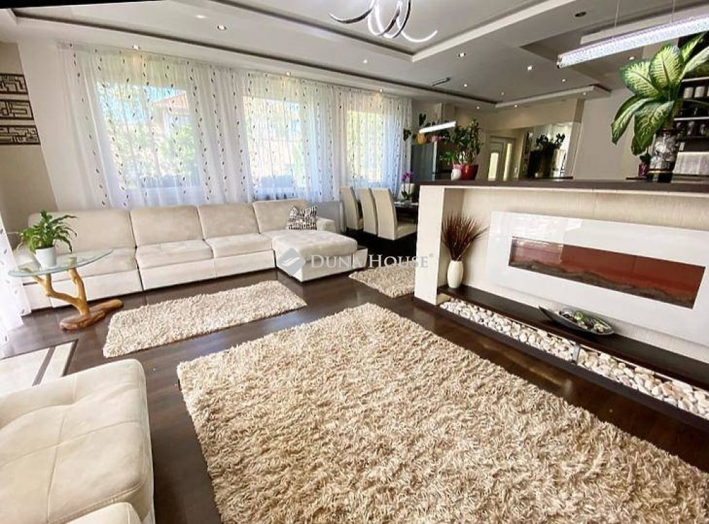 A ház riasztó - és klíma berendezéssel felszerelt. Az első lakrészben jelenleg az alábbi helyiségek találhatók: amerikai konyhás nappali, egy hálószoba, fürdőszoba +WC, kamra és külön leválasztott kertrész. A másik lakrészben - ami belső 2 szintes jelenleg - foglal helyet az amerikai konyhás nappali, (innen nyílik a terasz), emeleti 3 hálószoba, fürdőszoba, külön WC, kamra, valamint a padlástér is innen érhető el. A kert parkosított, öntözőrendszerrel ellátott. A kertben van egy medence, egy kerti tó, és egy fúrt kút is.