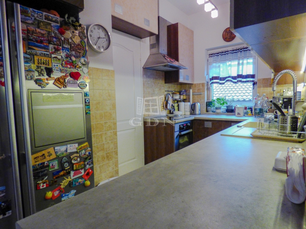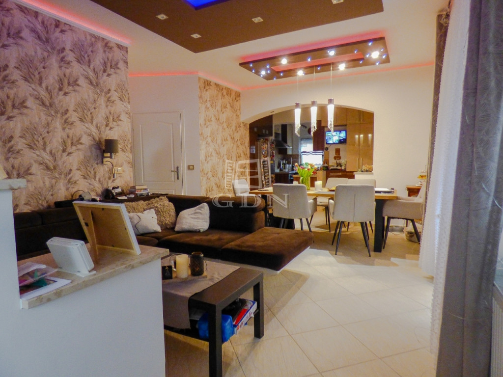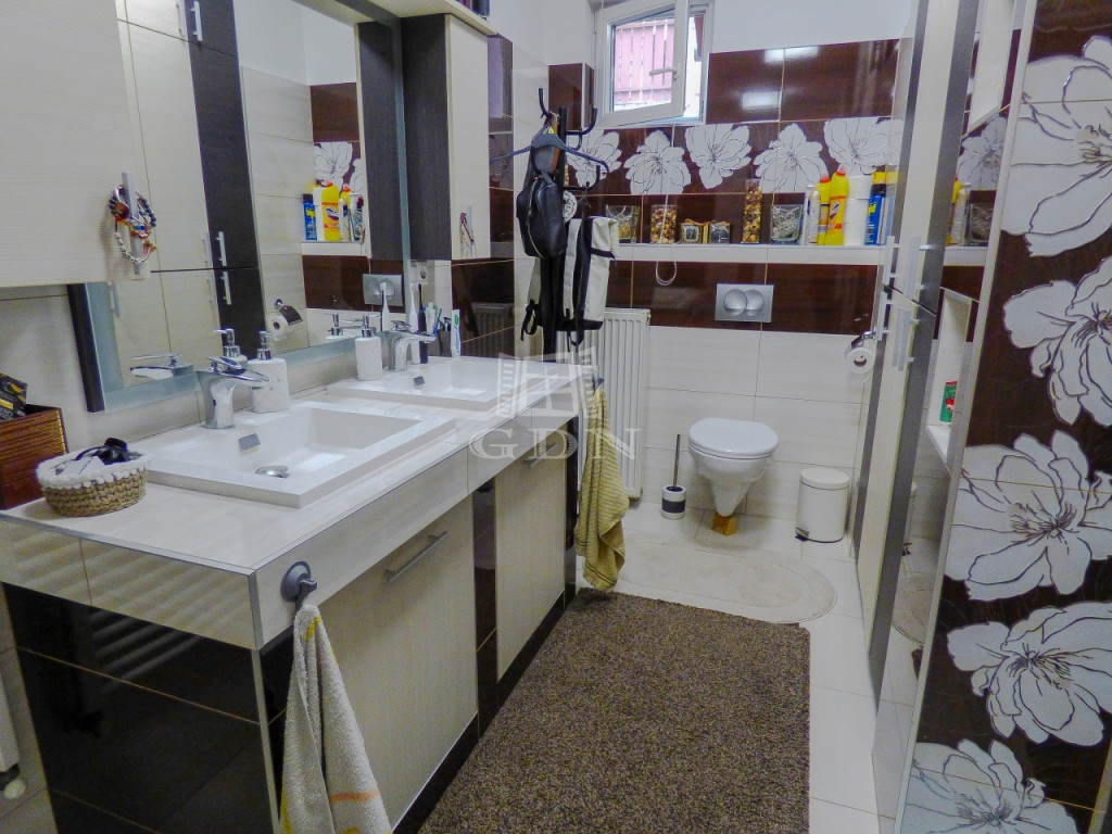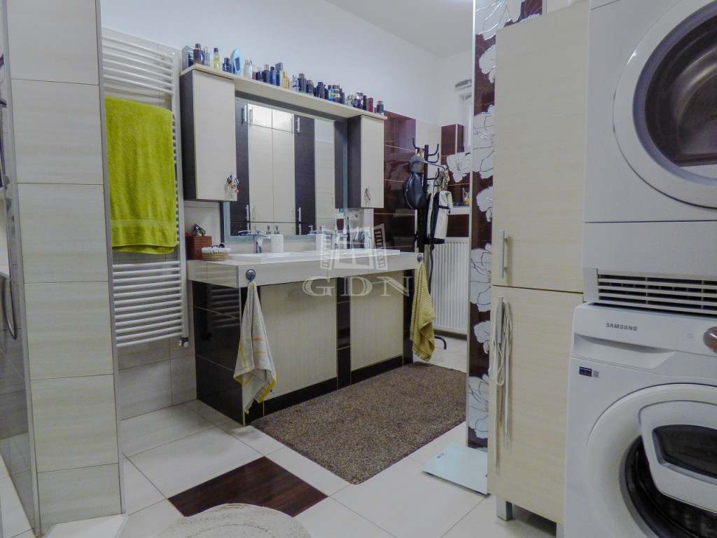 A nagyobbik lakrészen amerikai konyhás (kamrával), étkezős nappali, 4 hálószoba, 2 fürdőszoba, wc, infraszauna, gardrób, nagy terasz lett kialakítva két szinten.