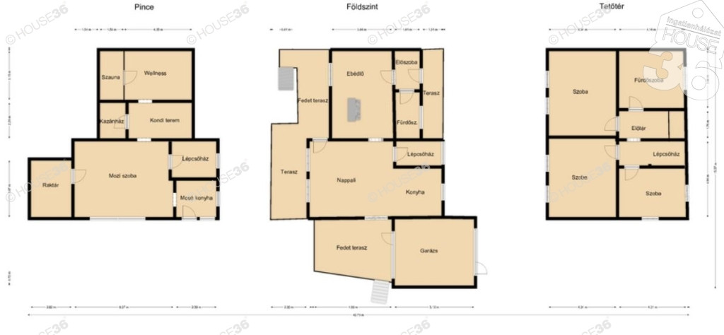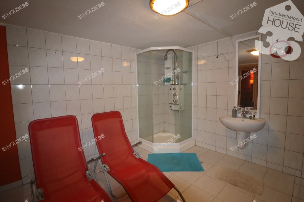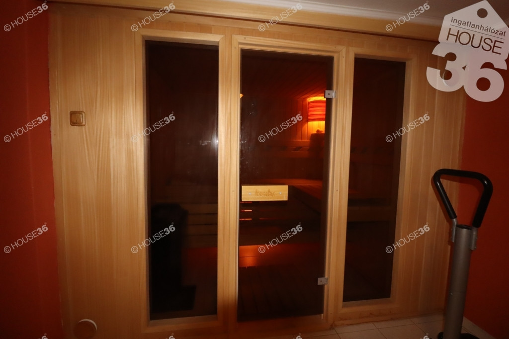 Az alagsorban wellness részleg szaunával, zuhanykabinnal, moziterem, kondiszoba, mosókonyha, nagyméretű tároló és kazánház