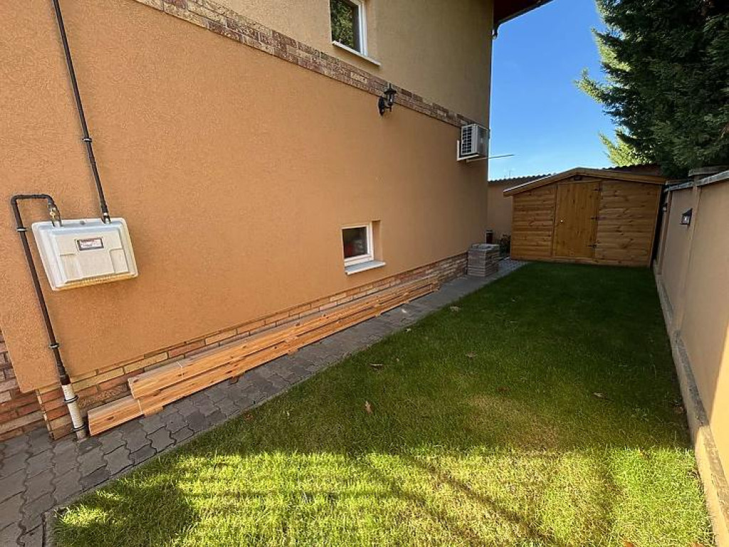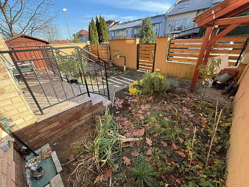 A 206 m²-es kert, öntözőrendszerrel ellátott, valamint egy 6 m²-es tároló is rendelkezésre áll. A házhoz két saját gépkocsibeálló tartozik: egyik a ház udvarán, a másik az elektromos kapu előtti területen található.