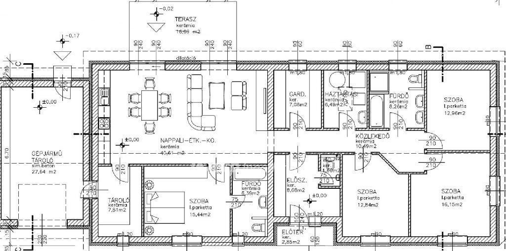 egy fürdőszobát WC-vel, egy külön WC-t, gardróbot, háztartási helyiséget, fűtött garázst és egy teraszt foglal magába.