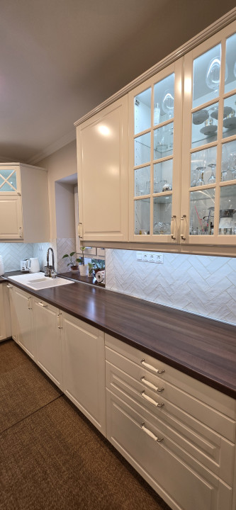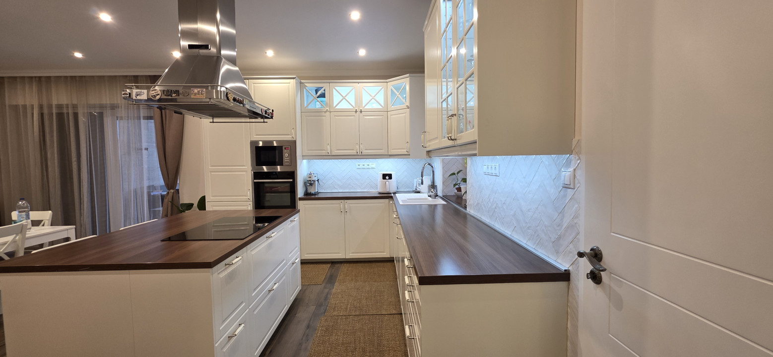 A modern konyha Neff elektromos sütővel és főzőlappal, Siemens mosogatógéppel, beépített mikrohullámú sütővel és páraelszívóval felszerelt — minden adott a kifinomult gasztronómiai élményekhez.
