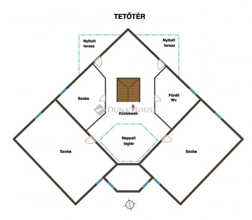 - Tetőtér: 2 szoba, háztartási helyiség, közlekedő, fürdő-wc