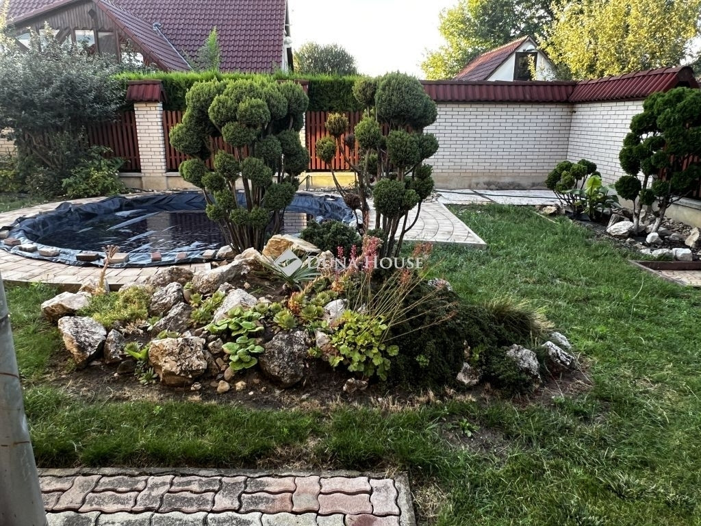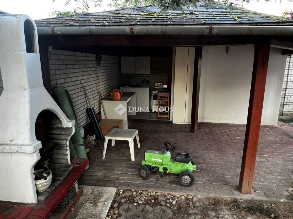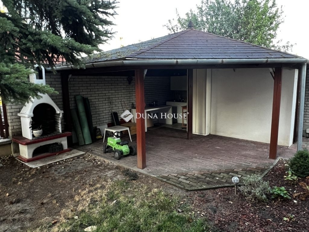 A 786 nm alapterületű telken árnyékot adó tuják, gondozott kert, térkövezett gépkocsibeálló, medence, solar zuhalyzó és egy nagy méretű, fedett kiülő - nyárikonyha található, melyhez tartozik egy kemence és egy zárható mellékhelyiség is.