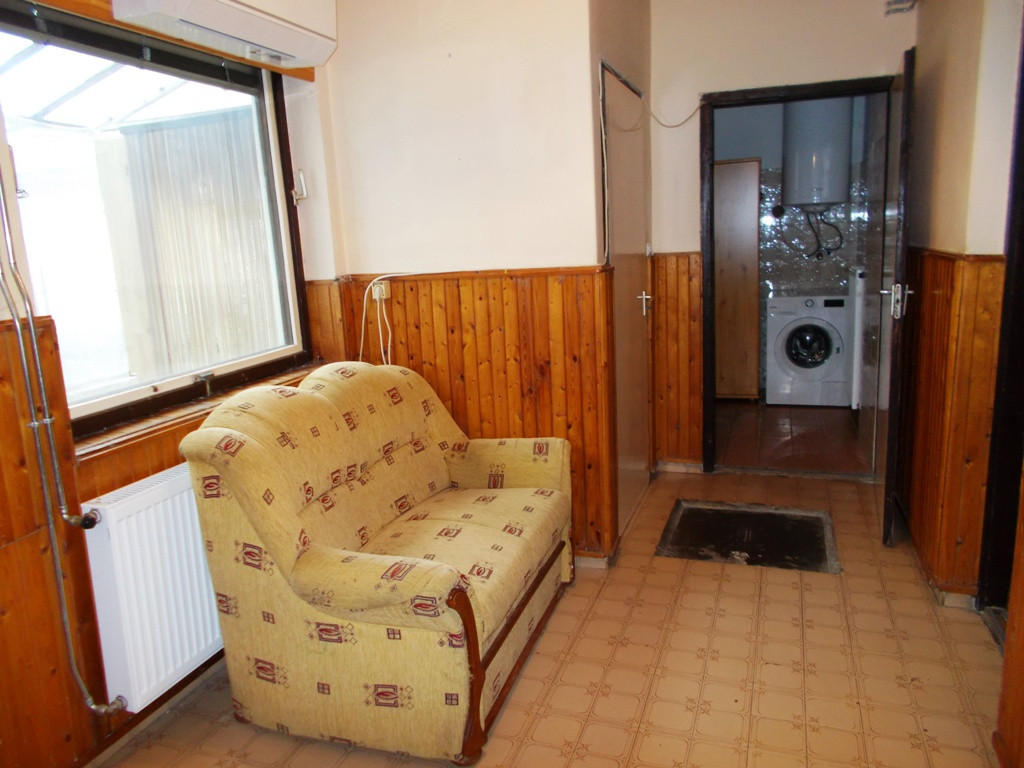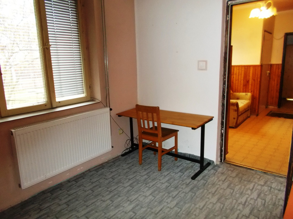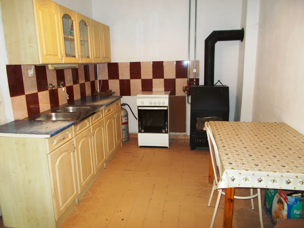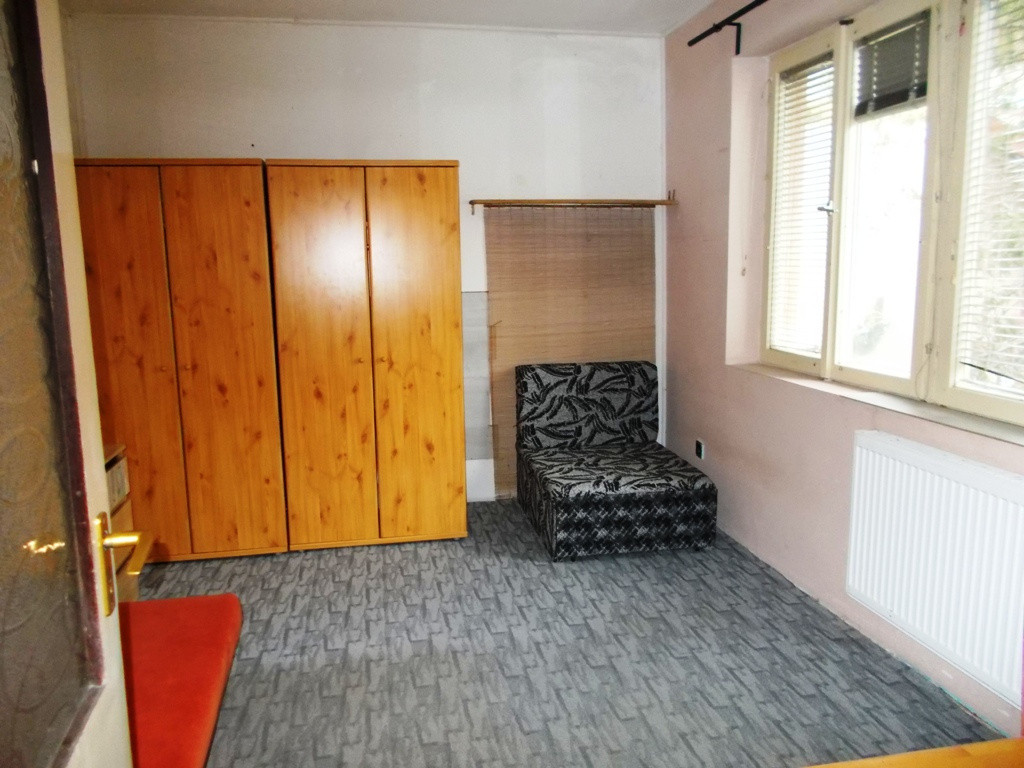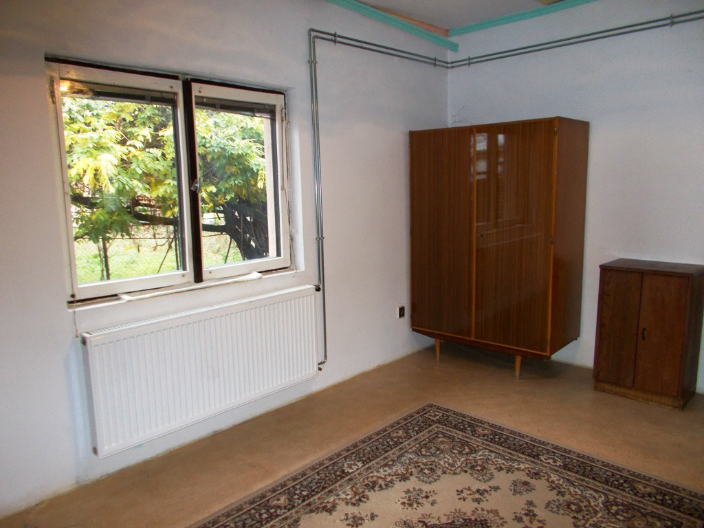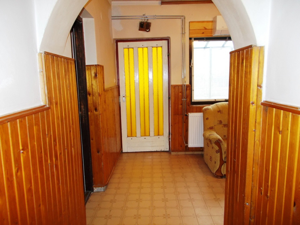 A ház elrendezése: fedett, 4 m2-es terasz, előszoba, konyha+étkező, kijárat a kertbe, kamra, 2 szoba, fürdőszoba, WC.