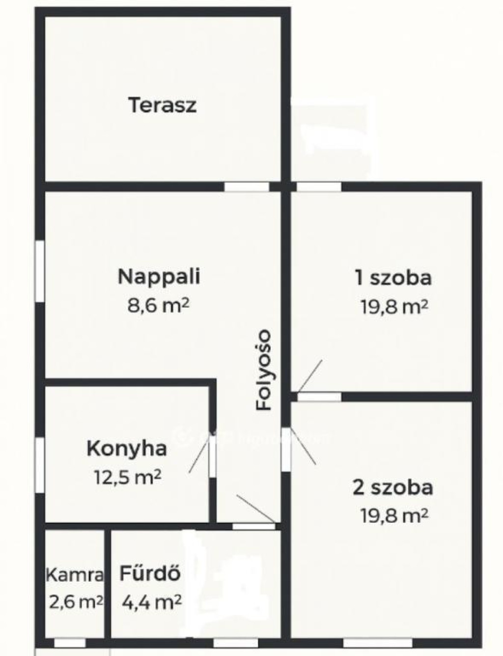 - 2 nagy szoba + konyha + kamra + fürdő + világos előtér
