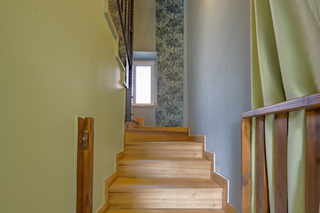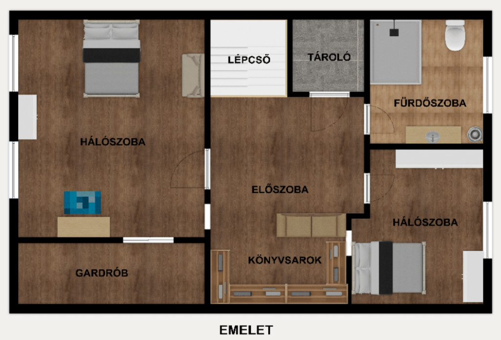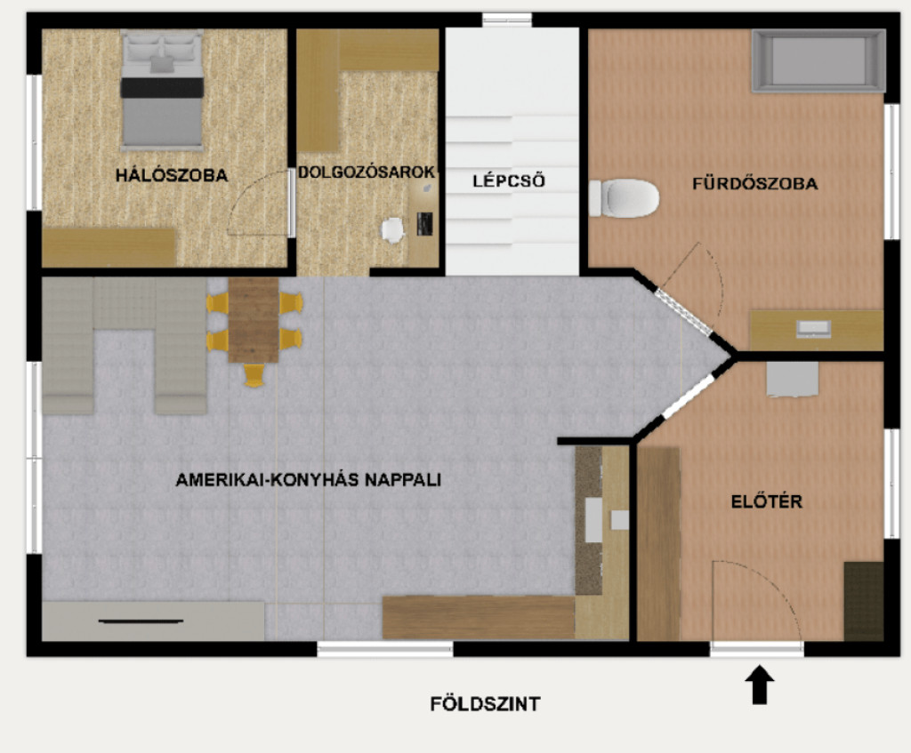 A földszinten amerikai konyhás nappali, hálószoba, dolgozósarok és kádas fürdőszoba található. Az emeleten két hálószoba, gardrób, nappali, zuhanyzós fürdőszoba, valamint egy tárolóhelyiség kapott helyet.