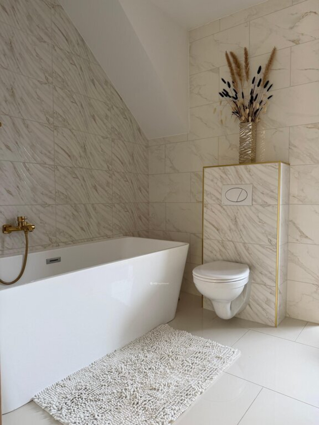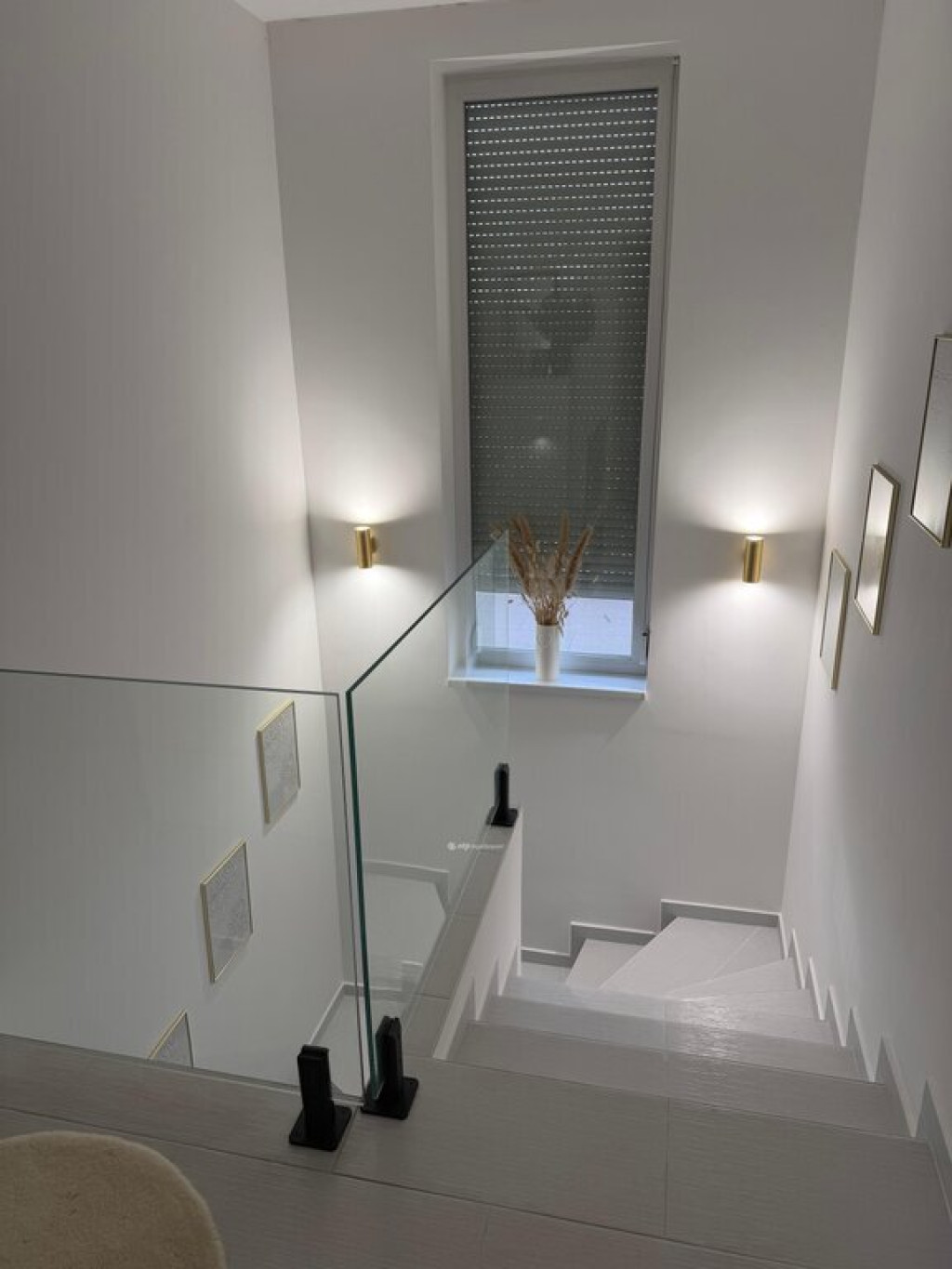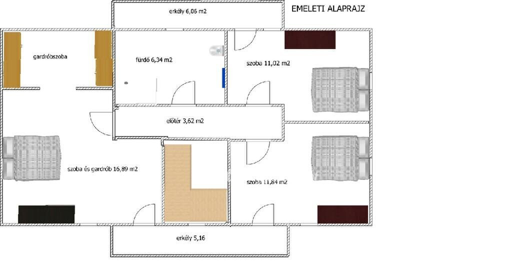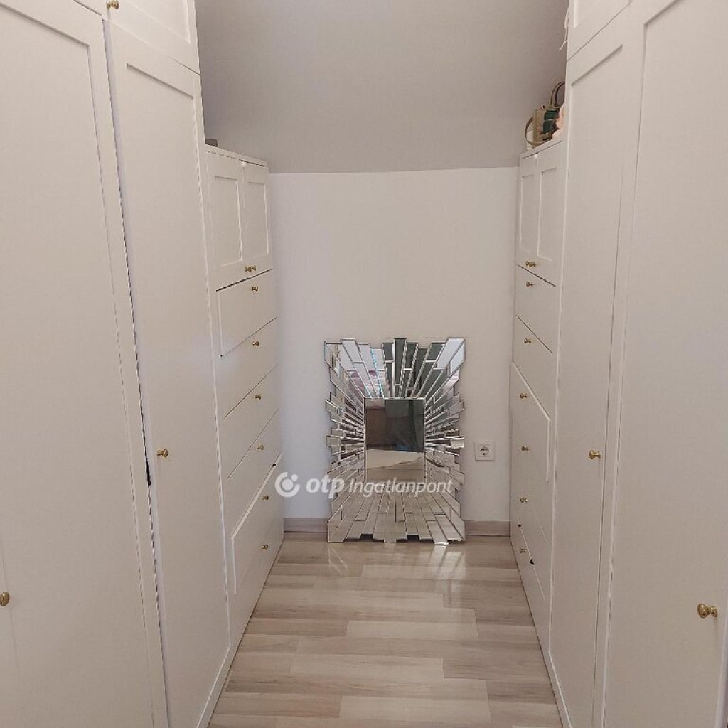 Ezen a szinten még egy exclusive kádas, dupla mosdós fürdőszoba áll a rendelkezésünkre geberites WC-vel. A nappaliból pedig kiléphetünk a hátsó kertbe, gyönyörű napozó terasszal, parkosított, fákkal szegélyezett, füves kertre. Az ebédlő térből nyílik a felső szintre felfutó hófehér lépcsősor, mely impozáns üvegkorláttal szegélyezett, világos, fényes. Felérve az emeletre egy közlekedő térbe érkezünk, ahonnan három hálószoba, egy gardrób szoba és egy fürdőszoba nyílik. Minden szoba ablakos és teraszos, ami a kitűnő elcsúsztatott tervezés eredménye. A gardrób és a szobák is Ikea bútorokkal harmonizálnak.
