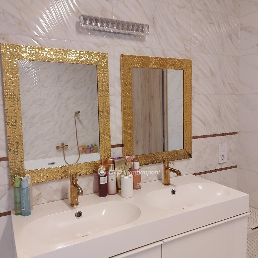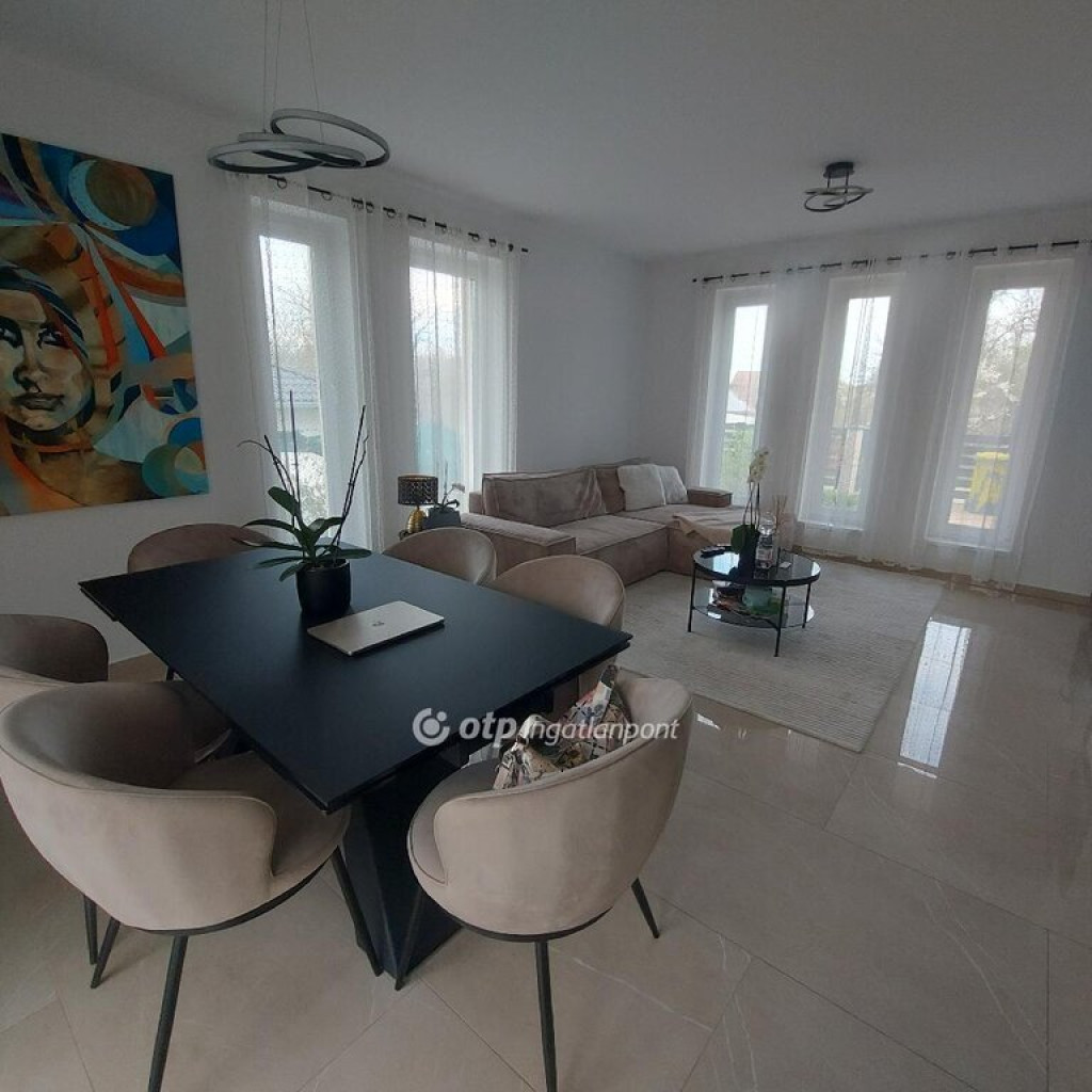 Eladásra kínálunk Pest megyében, Budapesttől 20-30-percre Dunavarsány Nagyvarsányi részén, az 51-es főúttól fél percre, tavak és a Duna közelségében, egy csendes utca domboldalán elhelyezkedő ikerházat, mely térbeli eltolással, és csak a gépészeti helyiségekkel összekötött a szomszéddal. A díszfás előkert két autó beállóval rendelkezik. A minden igényt kielégítő, 441 m2-es telken felépült 135 m2-es otthon első osztályú belső lakberendezése a homok szín, a púderes puha árnyalatok, az arany és az extravagáns fekete és fehér kiegyensúlyozott keveréke, amely már a belépéskor a luxus finomságait tárja elénk. Széles előszobában praktikus elrendezéssel nyílik a délnyugati fekvésű amerikai konyhás nappali, a fehér és fekete márványos árnyalatok váltják egymást a púderszínű bárszékekkel.A konyhabútor Ikea tervezésű, felső kategóriás gépekkel szerelt , finom arany hangsúlyokkal, a mosogatónál kilátással a kertre. Az ebédlő és a nappali bútorai is harmonizálva, hívogatóan gyönyörködtetik a szemet, mert a tágas, világos, minden oldalról ablakokkal és terasz ajtóval ellátott nagy tér és a puha kiegészítők, szőnyegek mind-mind a praktikus esztétikum jegyében kelnek összhangra. Az egyediséget egy borszoba is tetőzi közel a bárpulthoz, szinte látjuk magunk előtt, ahogy a barátokkal alig várjuk, hogy az egyedi tervezésű és berendezésű bortartókból az ízléses világításokkal szerelt térben a borospoharakba kerülhessen a kellően hidegen tárolt isteni nedű. Pazar a látvány, hívogat.
