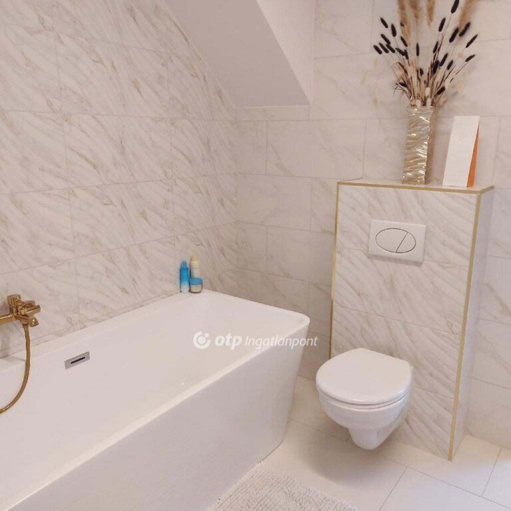 Ezen a szinten még egy exclusive kádas, duplamosdós fürdőszoba áll a rendelkezésünkre geberites WC-vel. A nappaliból pedig kiléphetünk a hátsó kertbe, gyönyörű napozó terasszal, parkosított, fákkal szegélyezett, füves kertre. Az ebédlő térből nyílik a felső szintre felfutó hófehér lépcsősor, mely impozáns üvegkorláttal szegélyezett, világos, fényes. Felérve az emeletre egy közlekedő térbe érkezünk, ahonnal három hálószoba, egy gardrób szoba és egy fürdőszoba nyílik. Minden szoba ablakos és teraszos, ami a kitűnő elcsúsztatott tervezés eredménye. A gardrób és a szobák is Ikea bútorokkal harmonizálnak.