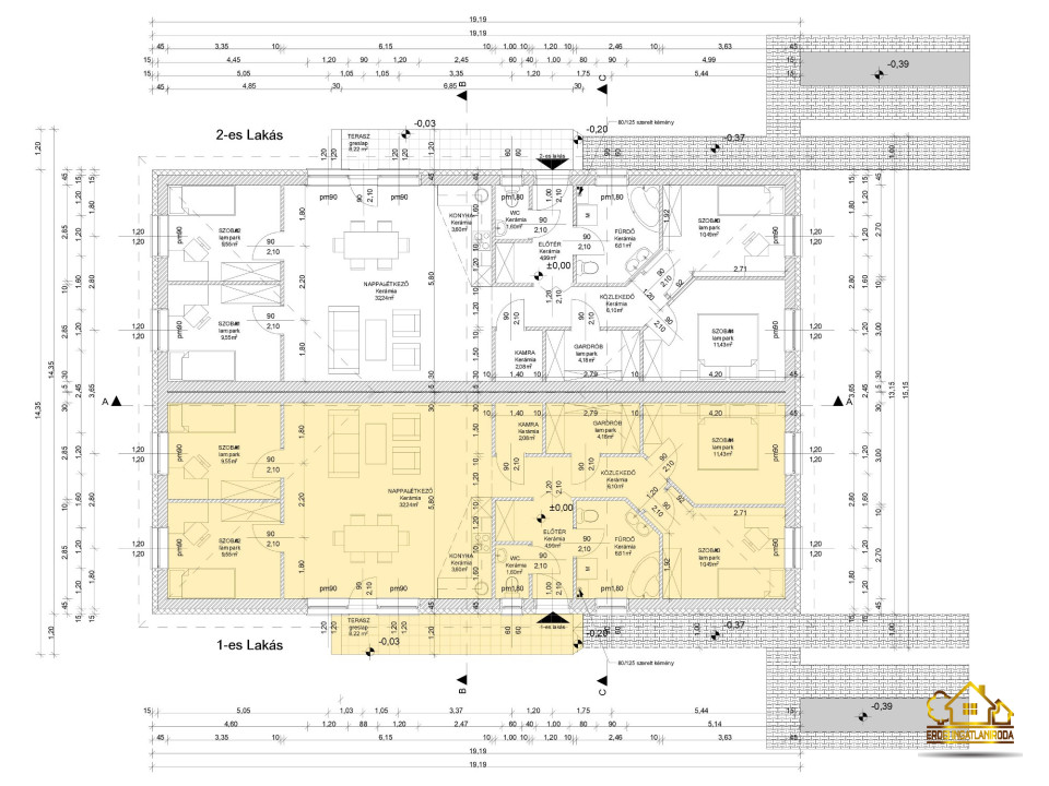Az épület 30-as téglából, 12 cm-es Grafit Reflex külső hőszigeteléssel, 3 rétegű műanyag nyílászárókkal, antracit betoncserép fedéssel épültek.
