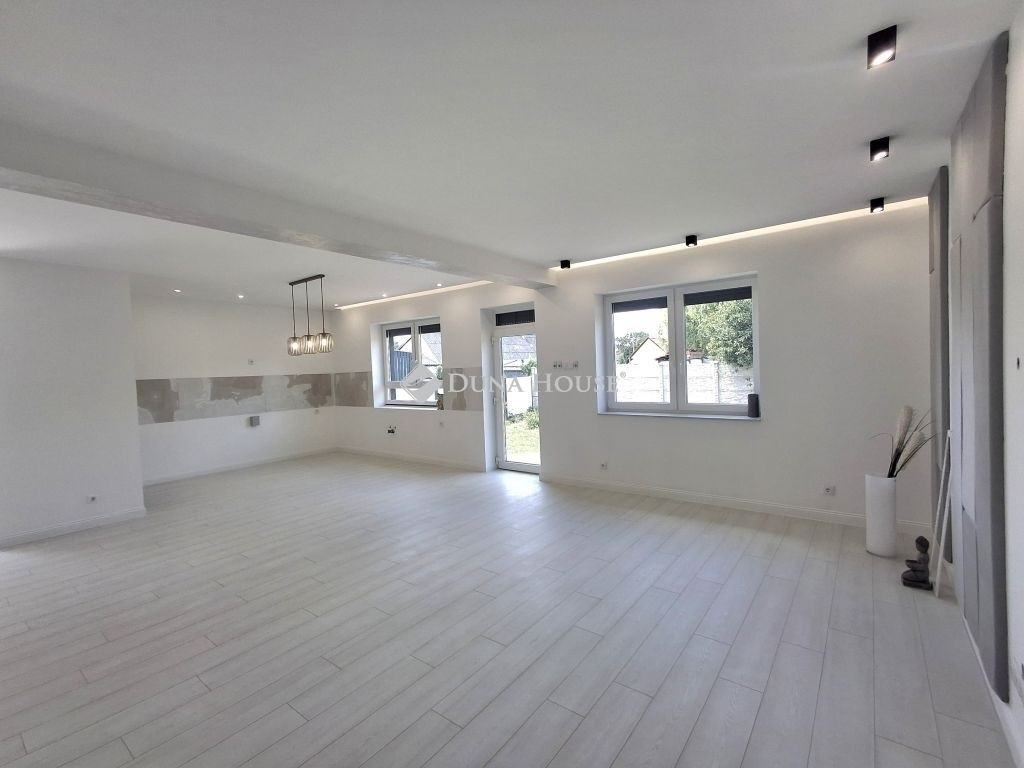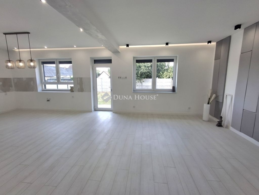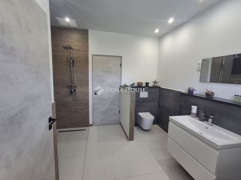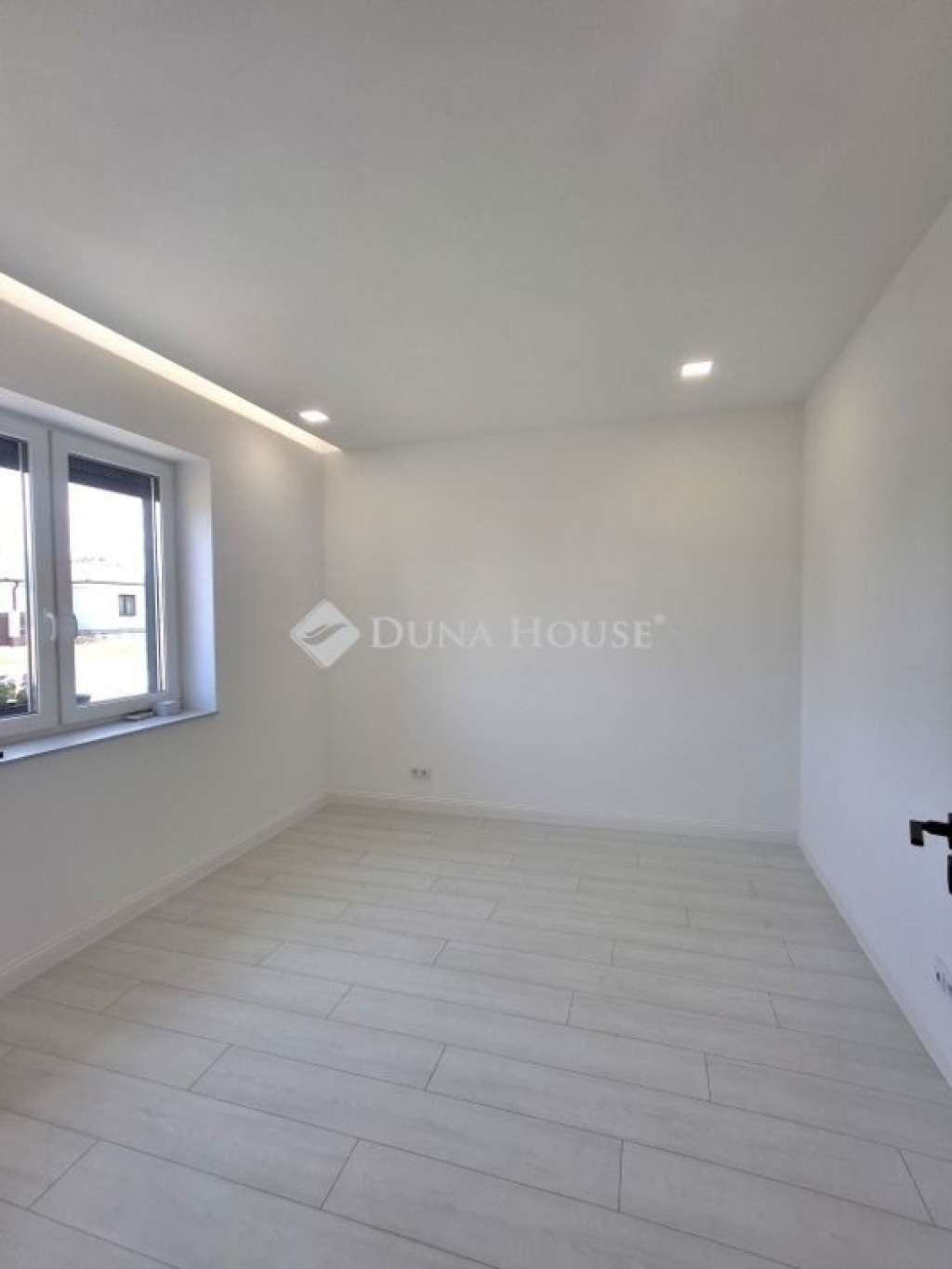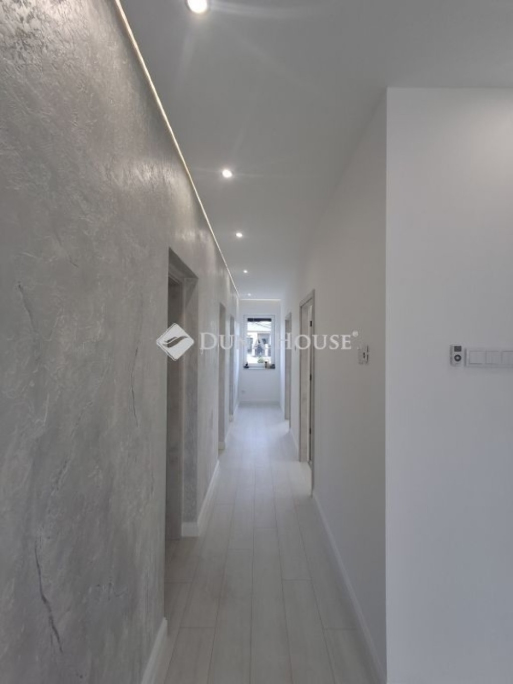 Helyiségei: amerikai konyha+ nappali, 3 szoba, fürdőszoba wc-vel, háztartási helyiség, külön vendég toalett, kamra, közlekedő, előszoba.