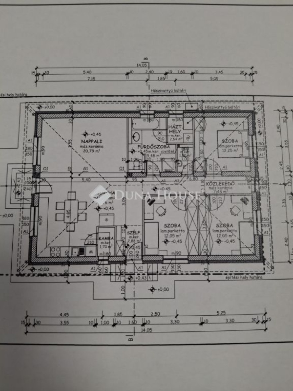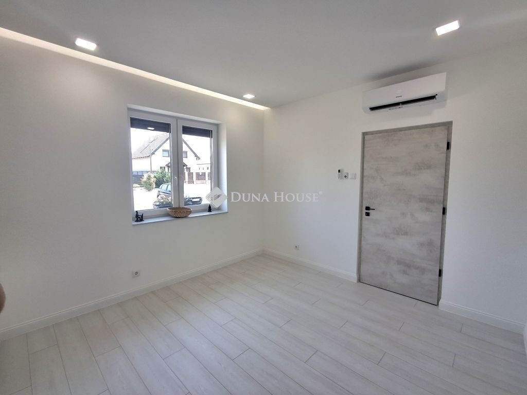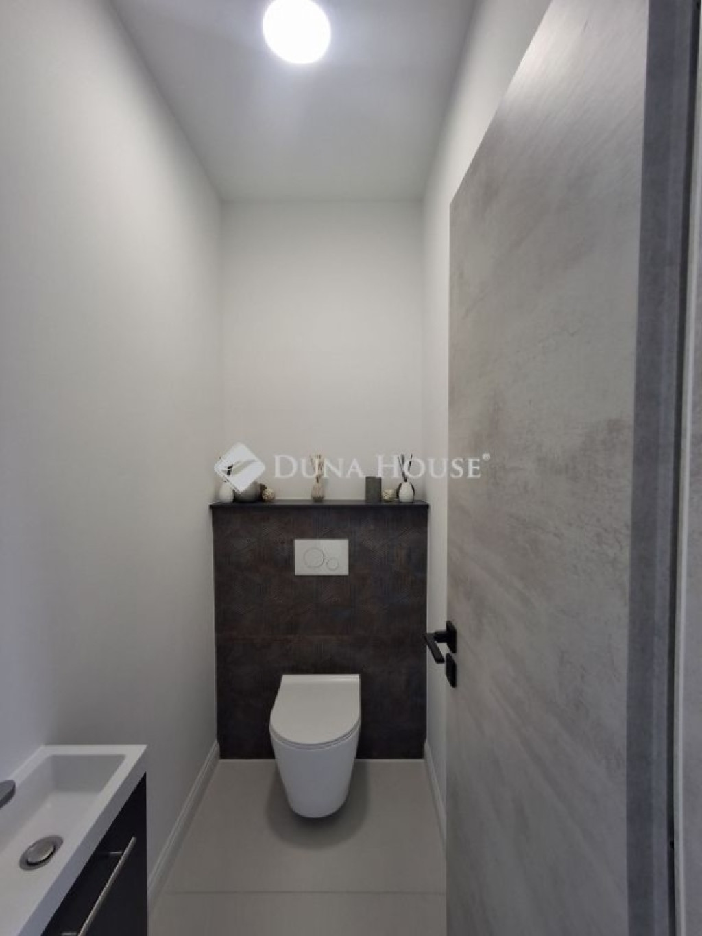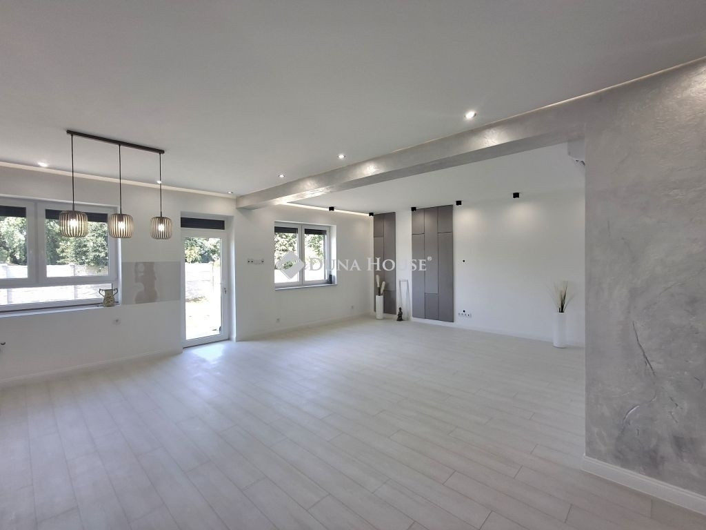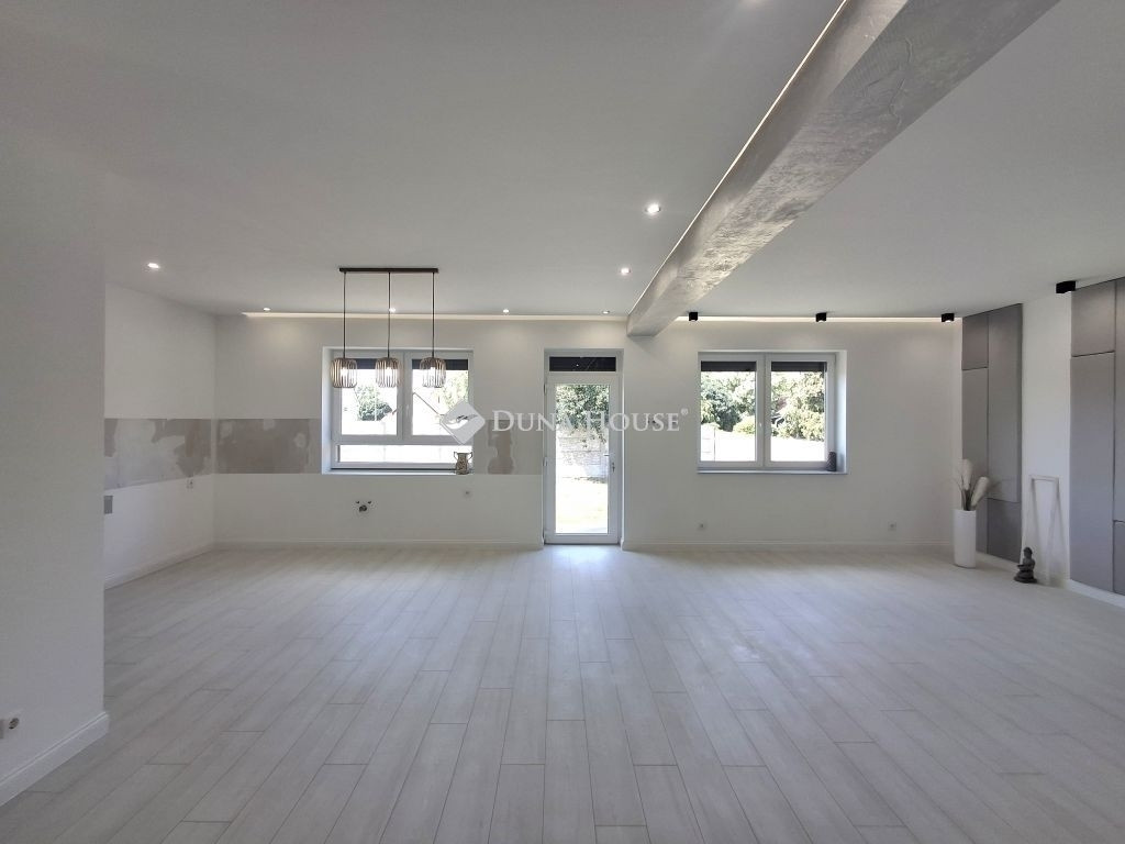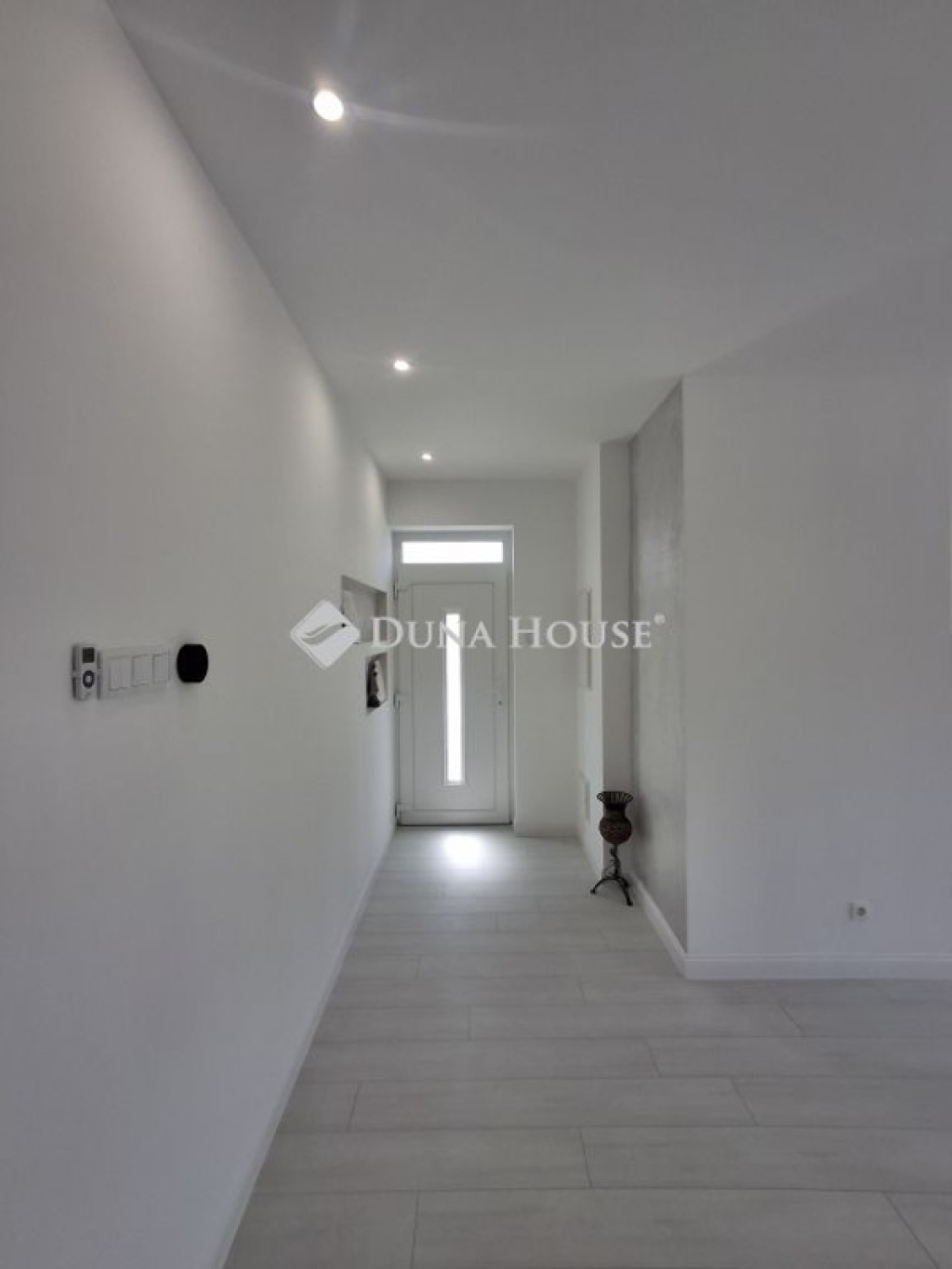 Helyiségei: amerikai konyha+ nappali, 3 szoba, fürdőszoba wc-vel, háztartási helyiség, külön vendég toalett, kamra, közlekedő, előszoba.
