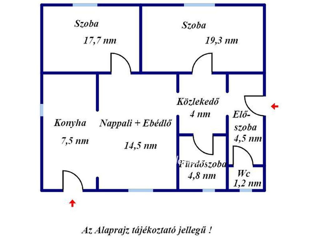 A 73,5 négyzetméteres otthon elrendezése élhető és átgondolt. Két külön nyíló szoba biztosítja a privát teret, a nappali és az ebédlő pedig a közös pillanatok helyszíne. A konyha, az előszoba és a közlekedő praktikus kialakítása a mindennapokat teszi egyszerűbbé, míg a különálló WC egy apró, de annál hasznosabb részlet.