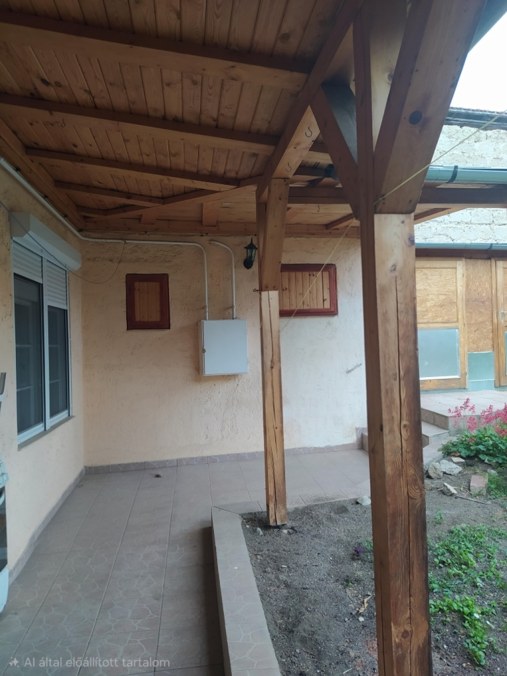 A ház előtt igényes, fa szerkezetű, fedett terasz került kialakításra.