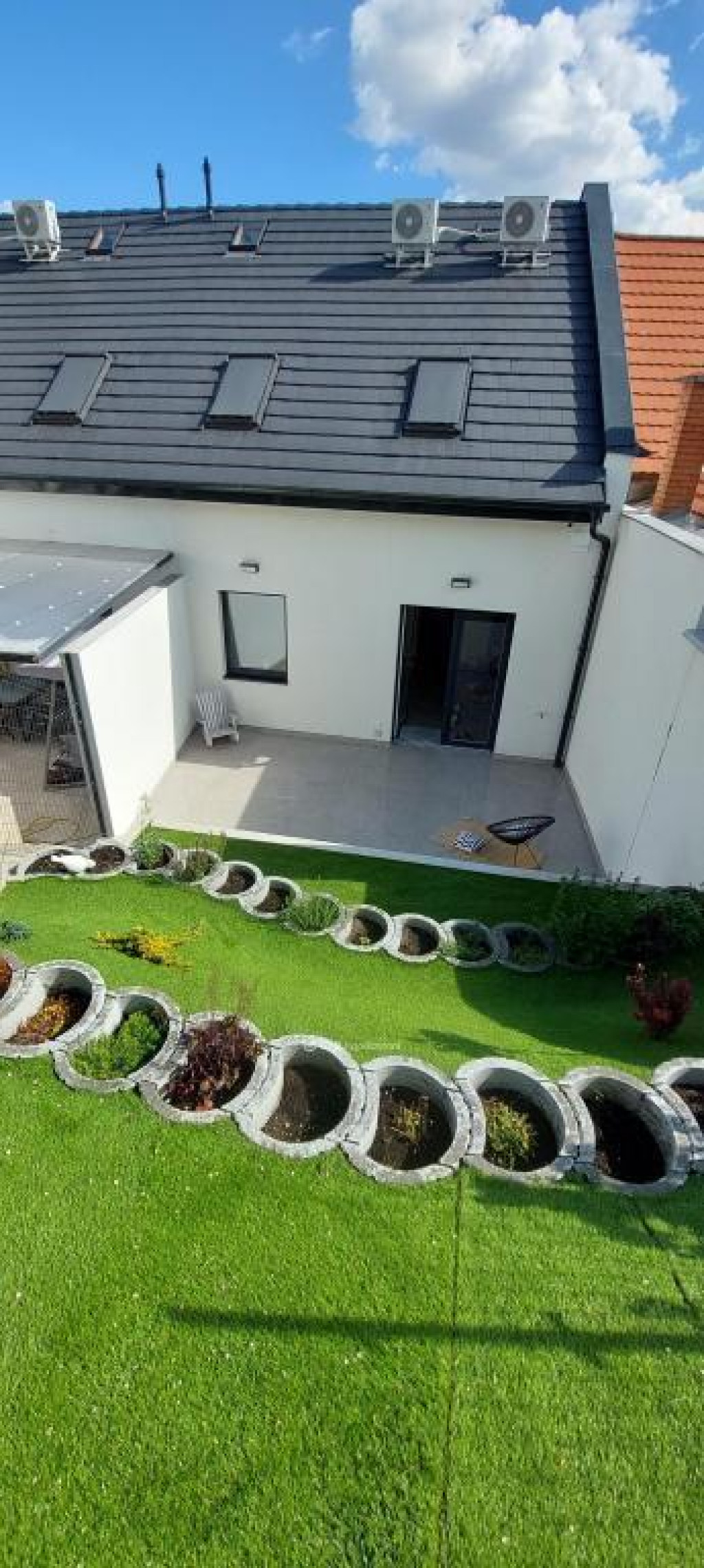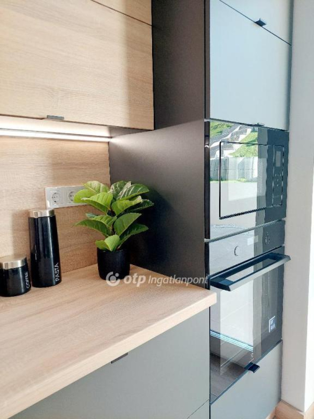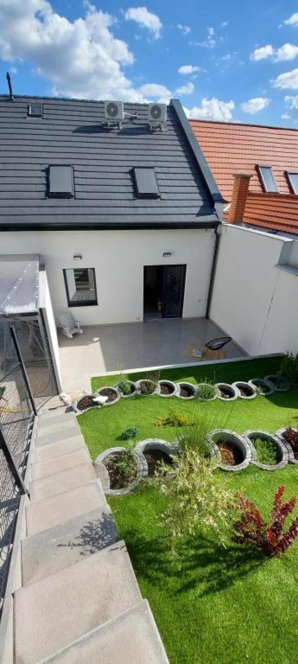 Az ingatlanban a földszinten garázs, amerikai konyhás nappali, 24 nm-es terasz és kert kapcsolattal, egyéb helyiséggel, az emeleten három szoba, fürdőszobával lett kialakítva. Az ingatlan kiváló energetikai besorolású. Az épület főfalai 30 N+F vázkerámia tégla falazat, 15 cm EPS hőszigeteléssel, az épületek közötti elválasztó fal 30 NF+GT hanggátló tégla falazat, a tetőfedés Terrán Zenit beton - tetőcseréppel, természetes színben. A homlokzati nyílászárók 3 réteg hőszigetelő üvegezéssel készültek, a tetőtéri ablakok hőszigetelő üvegezéssel, külső hővédő rolóval felszereltek.