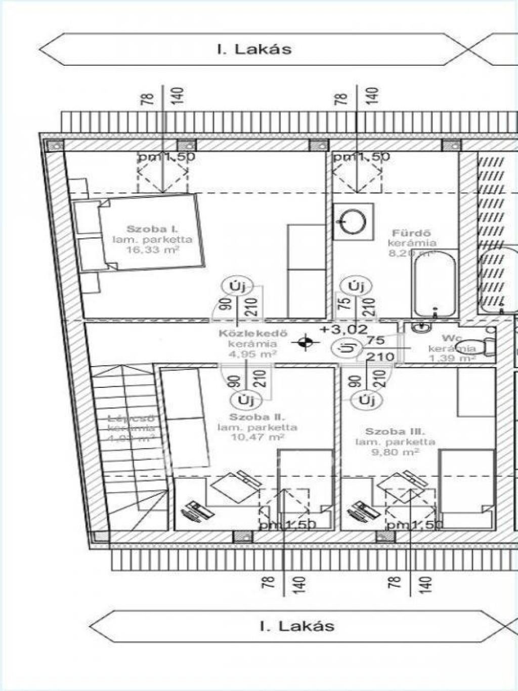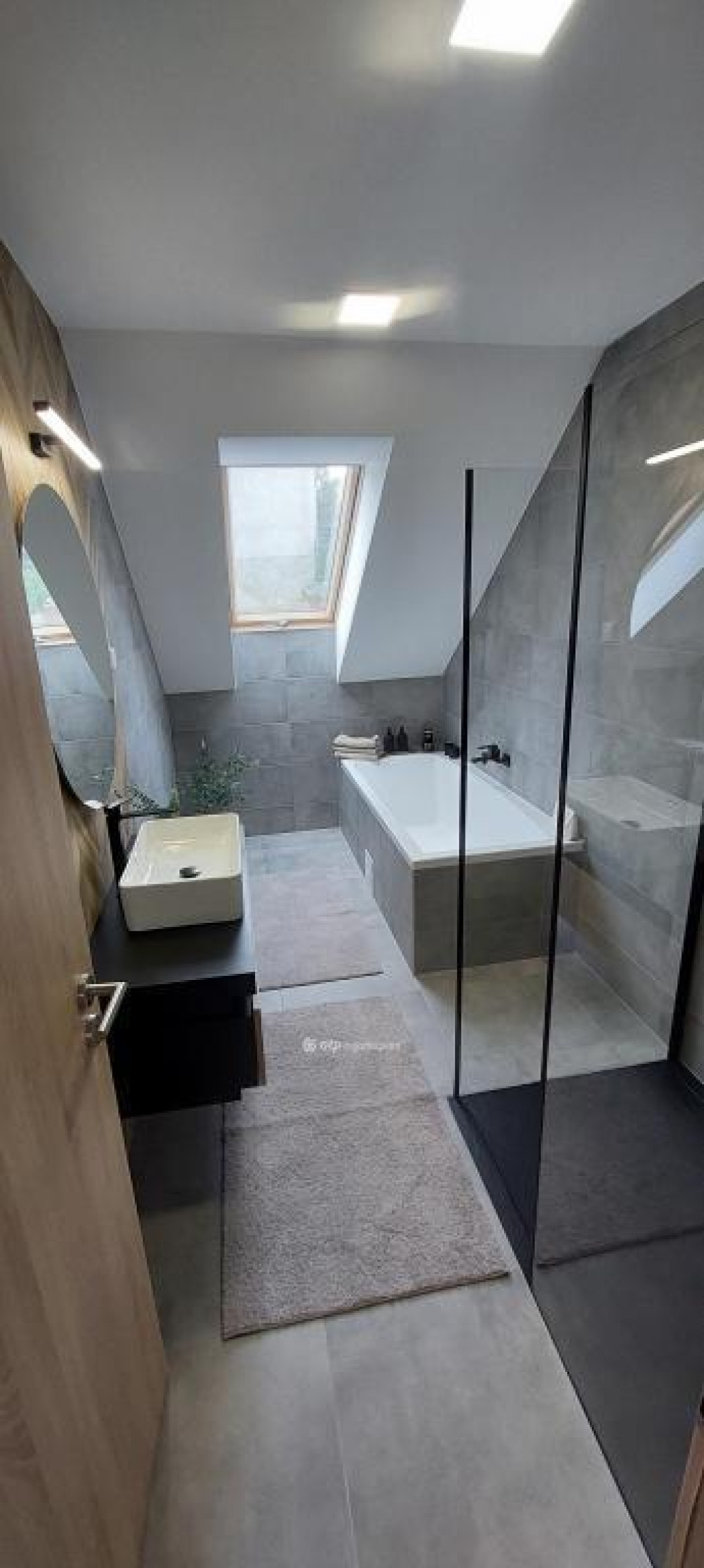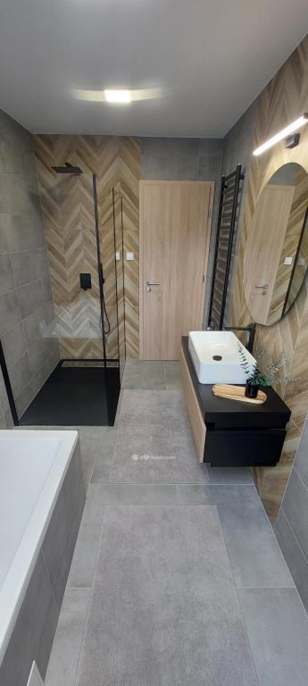Az ingatlanban a földszinten garázs, amerikai konyhás nappali, 24 nm-es terasz és kert kapcsolattal, egyéb helyiséggel, az emeleten három szoba, fürdőszobával lett kialakítva. Az ingatlan kiváló energetikai besorolású. Az épület főfalai 30 N+F vázkerámia tégla falazat, 15 cm EPS hőszigeteléssel, az épületek közötti elválasztó fal 30 NF+GT hanggátló tégla falazat, a tetőfedés Terrán Zenit beton - tetőcseréppel, természetes színben. A homlokzati nyílászárók 3 réteg hőszigetelő üvegezéssel készültek, a tetőtéri ablakok hőszigetelő üvegezéssel, külső hővédő rolóval felszereltek.